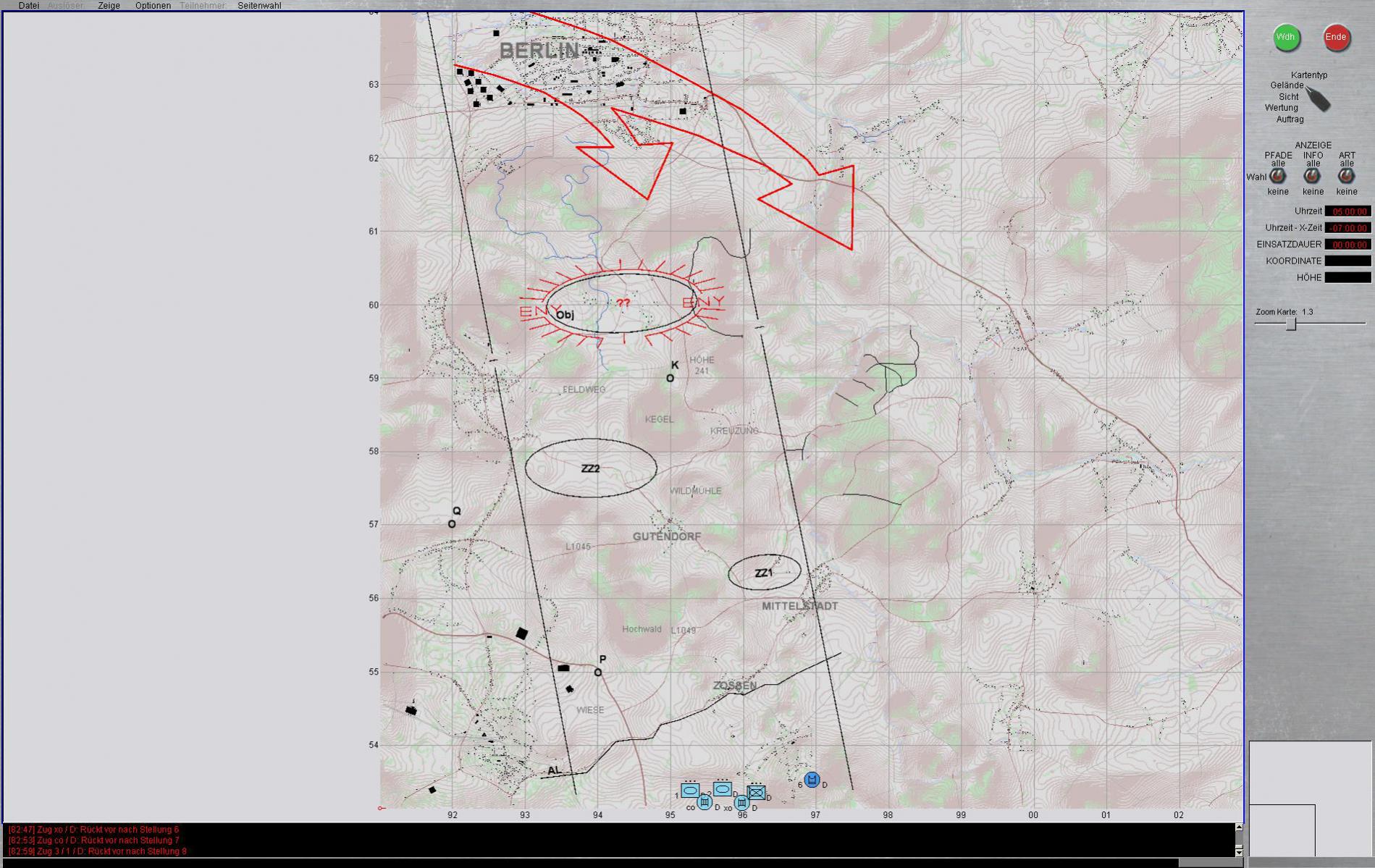 Kdr PzBtl911 hat die Absicht mit 4./- im befohlenen Gefechtsstreifen, Gefechtsaufklärung durch Kampf durchzuführen. Mit dem Rest des Btl`s zügig Einsatzraum 1500 südlich Zossen zu erreichen.