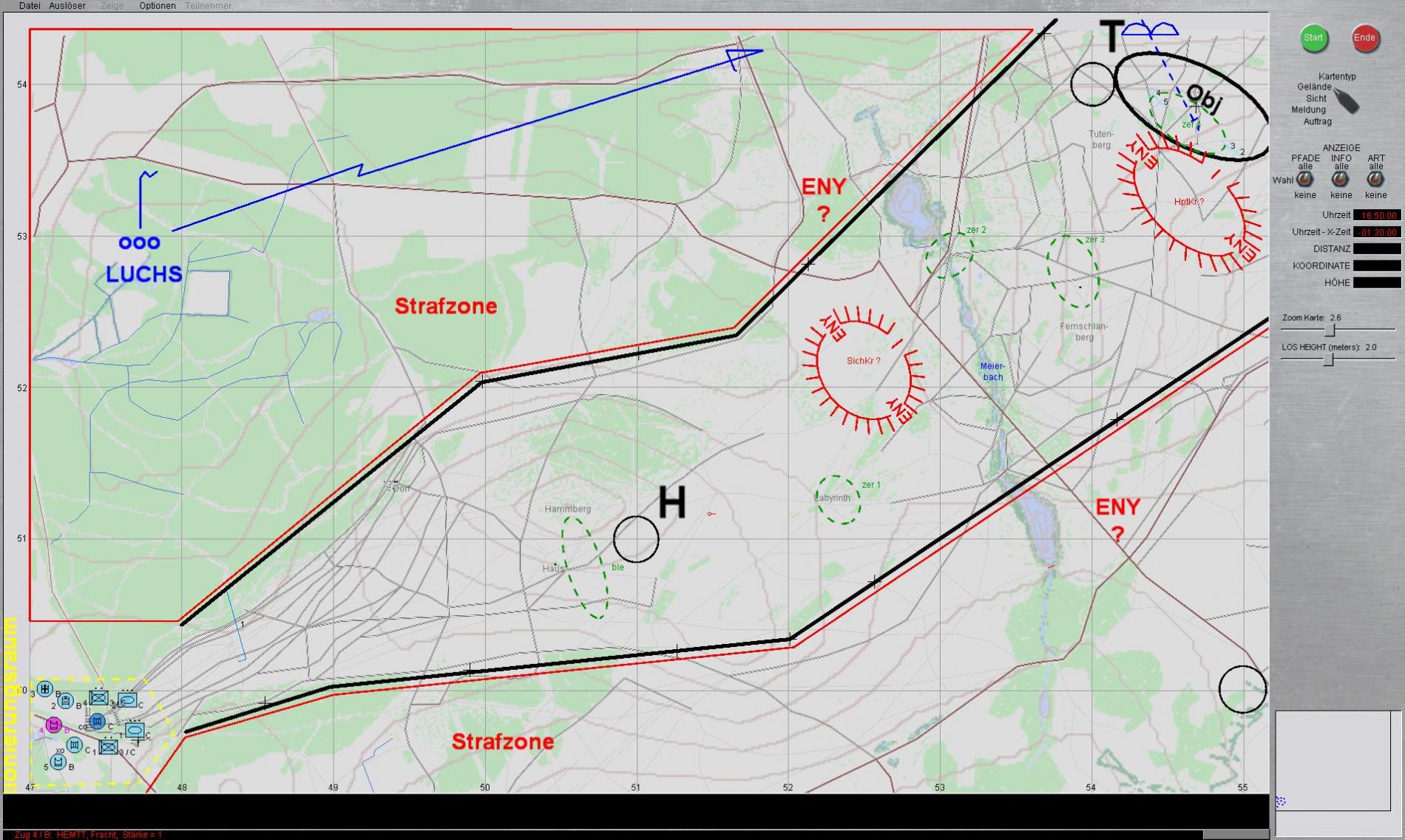 [/INDENT][INDENT][INDENT]PzBrig 91 im Raum FALLINGBOSTEL - OSTENHOLZ - WALSRODE bereitet sich derzeit auf Angriff in den RAUM WIETZENDORF - BERGEN - LANGEMANNSHOF vor. BrigSpähZg 910 und vstkPzBtl 911 klären dazu zunächst bis Linie SINNBERG - TUTENBERG - ORTSBERG auf. Hält SGL TUTENBERG zusätzlich mit LL-Kräften.