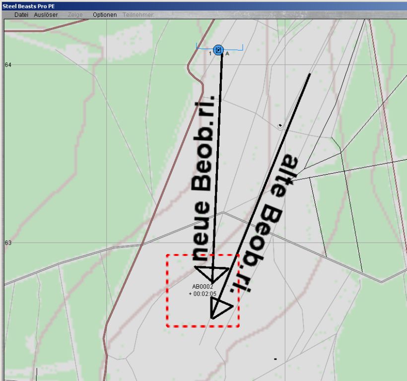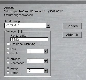 Jeder Feuerauftrag kann wiederholt und korrigiert werden. Dies erfolgt über das Kontextmenü "Ustg". Die Beobachtungsrichtung ist dabei entscheidend. Wenn man sich seit dem letzten Feuerschlag bewegt hat erleichtert die Feuerkorrektur mit "Alte Beobachtungsrichtung" die Korrektur ungemein.