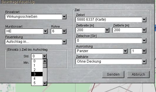 Aufschlag in ...: Es wird ein Feld in die Karte eingetragen. Das Feuer erfolgt dann nach vorgegebener Zeit.