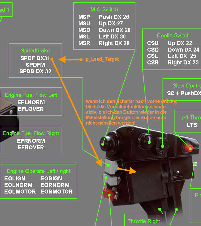 Da das Halten der Taste P (Vorhalten) während des Nachführens der Hauptwaffe lästig ist, möchte ich sie auf eine Taste legen. Diese Funktion soll auf der Schubsteuerung (Throttle) auf der Taste SPDF zum Einsatz kommen. (SPD hat nix mit der Partei zu tun :-), sondern ist der Name des Schalters, F ist die Position des Schalters hier forward = vorne.VORGEHENSWEISE: