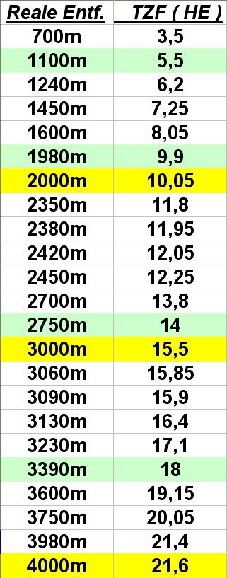 • Mit anderen Worten: Geschätzte oder gemessene Entfernung halbieren und diesen Aufsatz im TZF einstellen - d.h. bei realer Entfernung 1800m ist auf der HE-Skala der Aufsatz für 900m einzustellen. Wie man sehen kann, kommt das über einen weiten Entfernunsgbereich den idealen Aufsatzwerten sehr nahe.