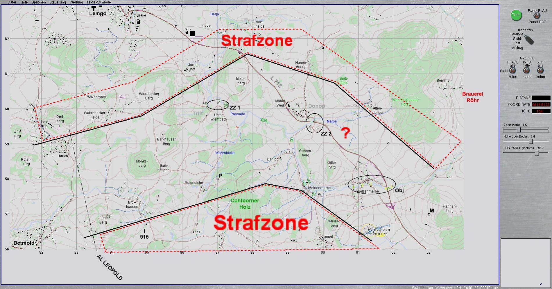 BLAU bekommt die Punkte für ZZ1, ZZ2 und Obj nur, wenn die eigenen Kräfte dort > als die feindlichen Kräfte sind. Diese Räume müssen besetzt sein mit mindestens einem Soldaten oder einem Fahrzeug.