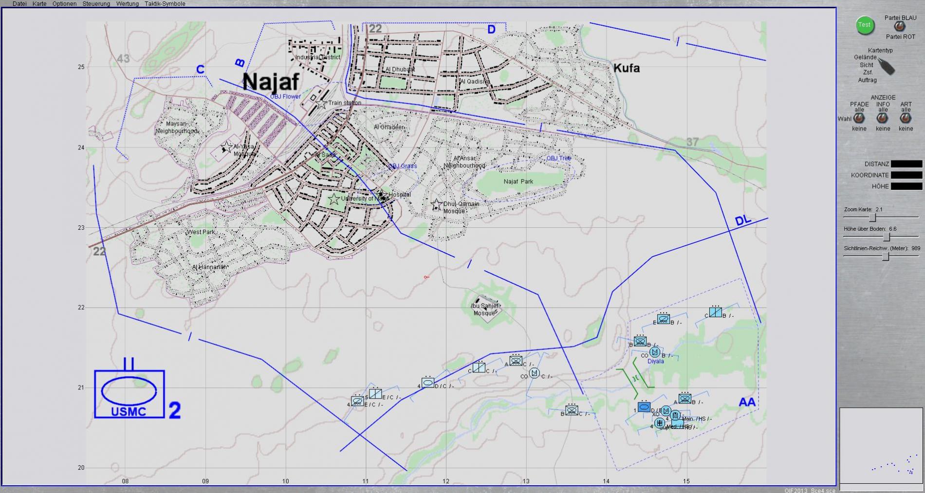 C Coy tritt als äusserst westliches Teil auf die westlichen Bezirke NAJAFS an und sichert diese. B Coy tritt zwischen Bahnlinie und Universitäts-
