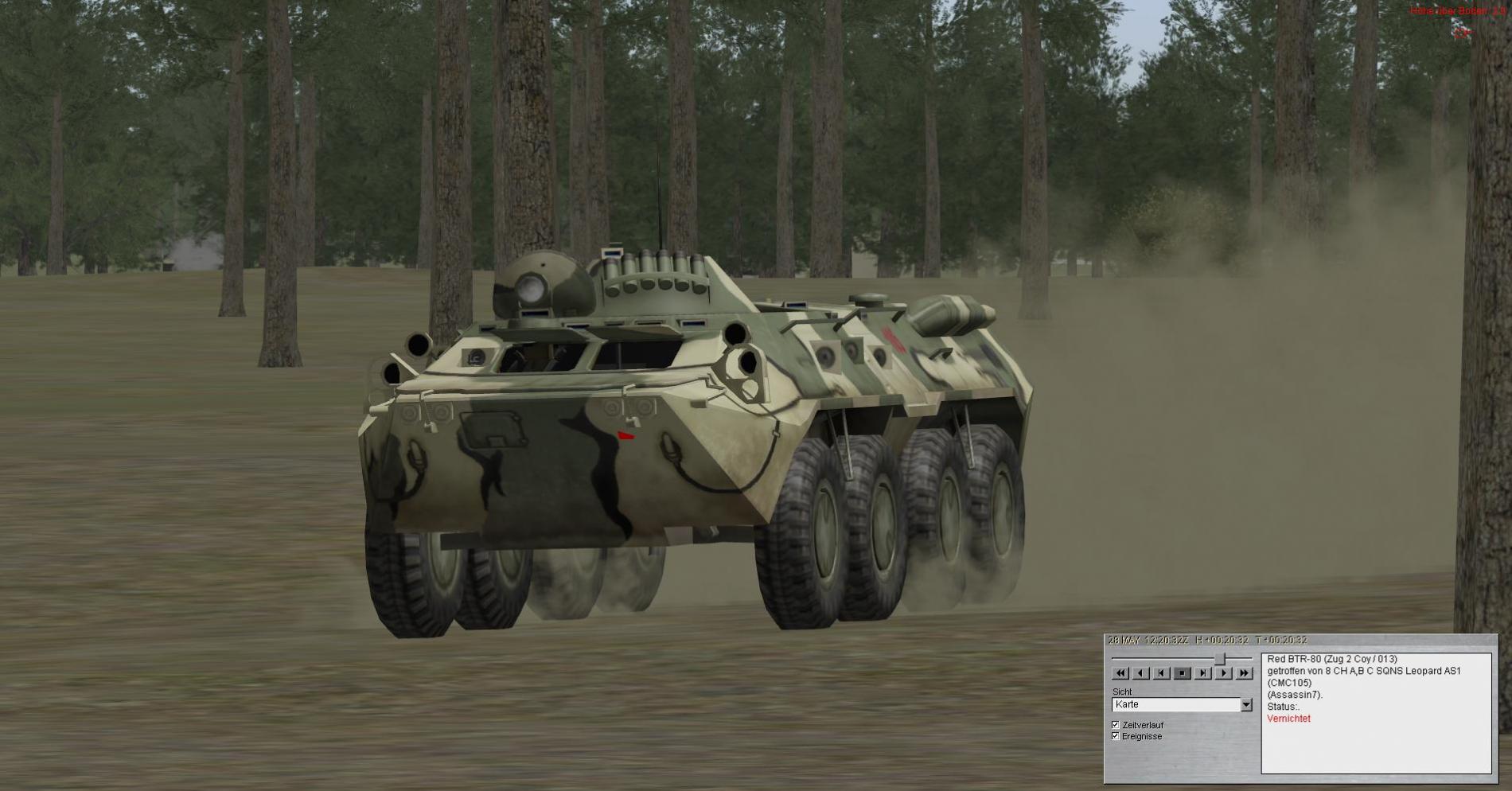 A few BTR-80’s units from the 302th MRR moved into the AO, and were tracked down and stopped. They had entered the rear of the battle position, just drove straight through, a sharp 12B crew swung their L7 around at max turn rate, and sent the dart into the amour at nearly the speed of sound. The wingman 12A followed with another sabot. The battle position was on fire with gunfire and sabots.