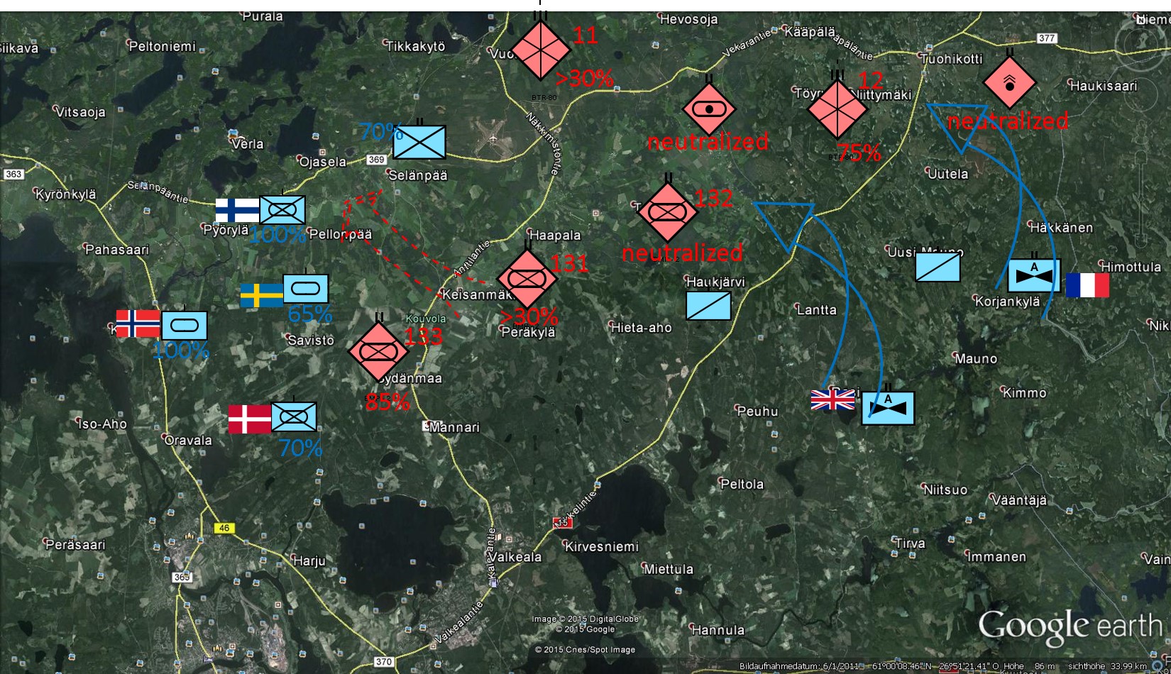 MechRgt 12(BTR)(+) durch Eigene Luft und Art angriffe auf etwa 75% Stärke Reduziert auf March vermtl in den Raum KEISANMÄKI