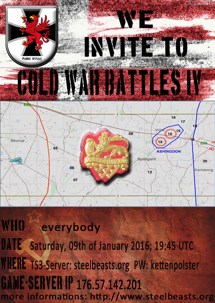 [INDENT]A BMD-equipped Soviet airborne company has established a defensive position vicinity RYDSGARD-VILLIE. Intelligence believes its mission is to block E65 to friendly forces advancing east and protect Soviet Naval Infantry regiment established vicinity YSTAD 18KM south-east. The company may be supported by up to six 120 mm mortars from its parent regiment. Intelligence also believes Naval Infantry regiment in YSTAD may have established quick reaction force (QRF) of up to reinforced tank company strength which could provide support to the airborne company if required. It is anticipated QRF will scramble if airborne company is in danger of being overrun and can be expected in RYDSGARD-VILLIE after approximately 25 minutes.[/INDENT][INDENT]b)Friendly Forces:[/INDENT]