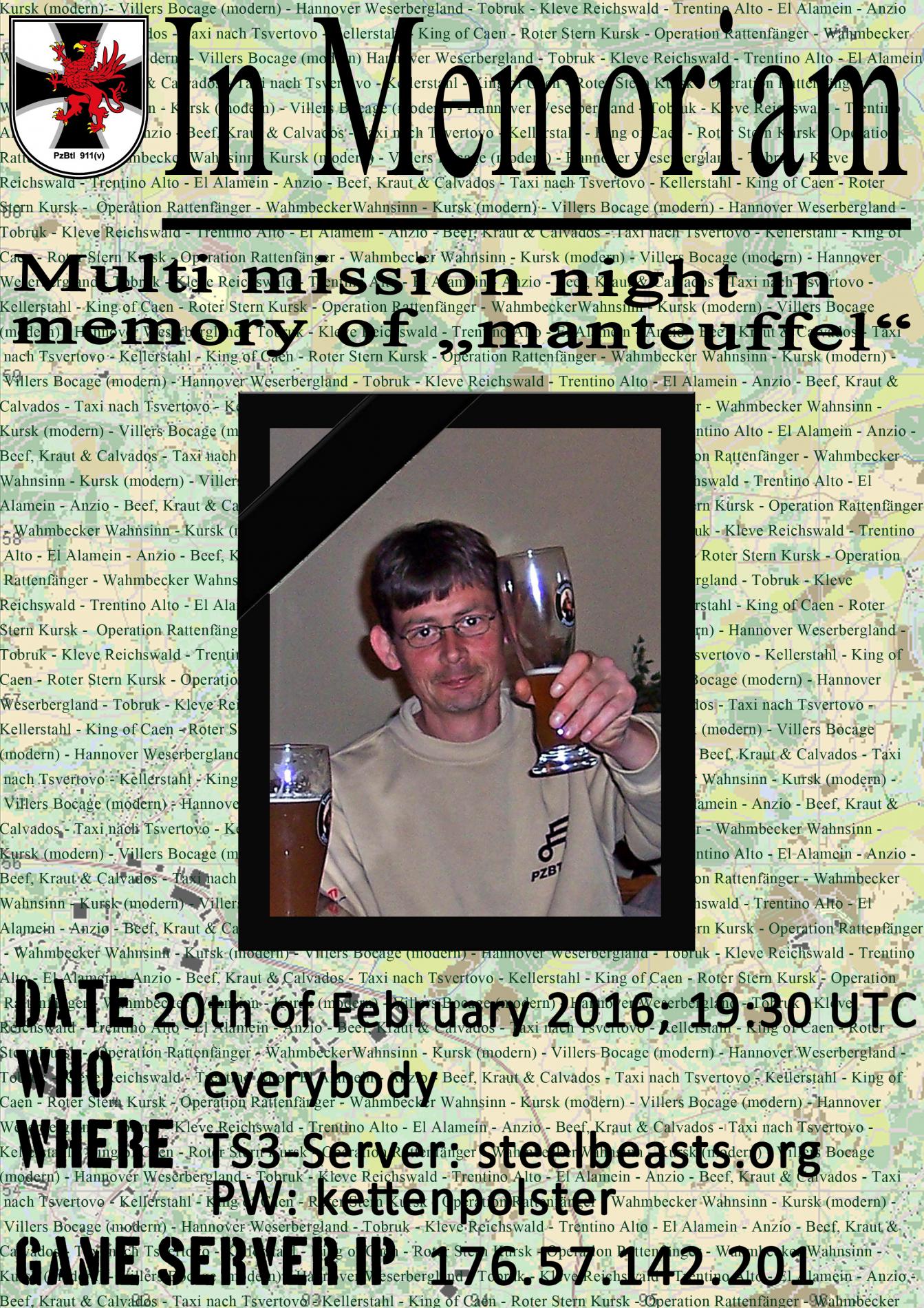 Zum Gedenken an unser kürzlich verstorbenen Kameraden manteuffel, veranstalten wir einen Multiplayer Abend.
