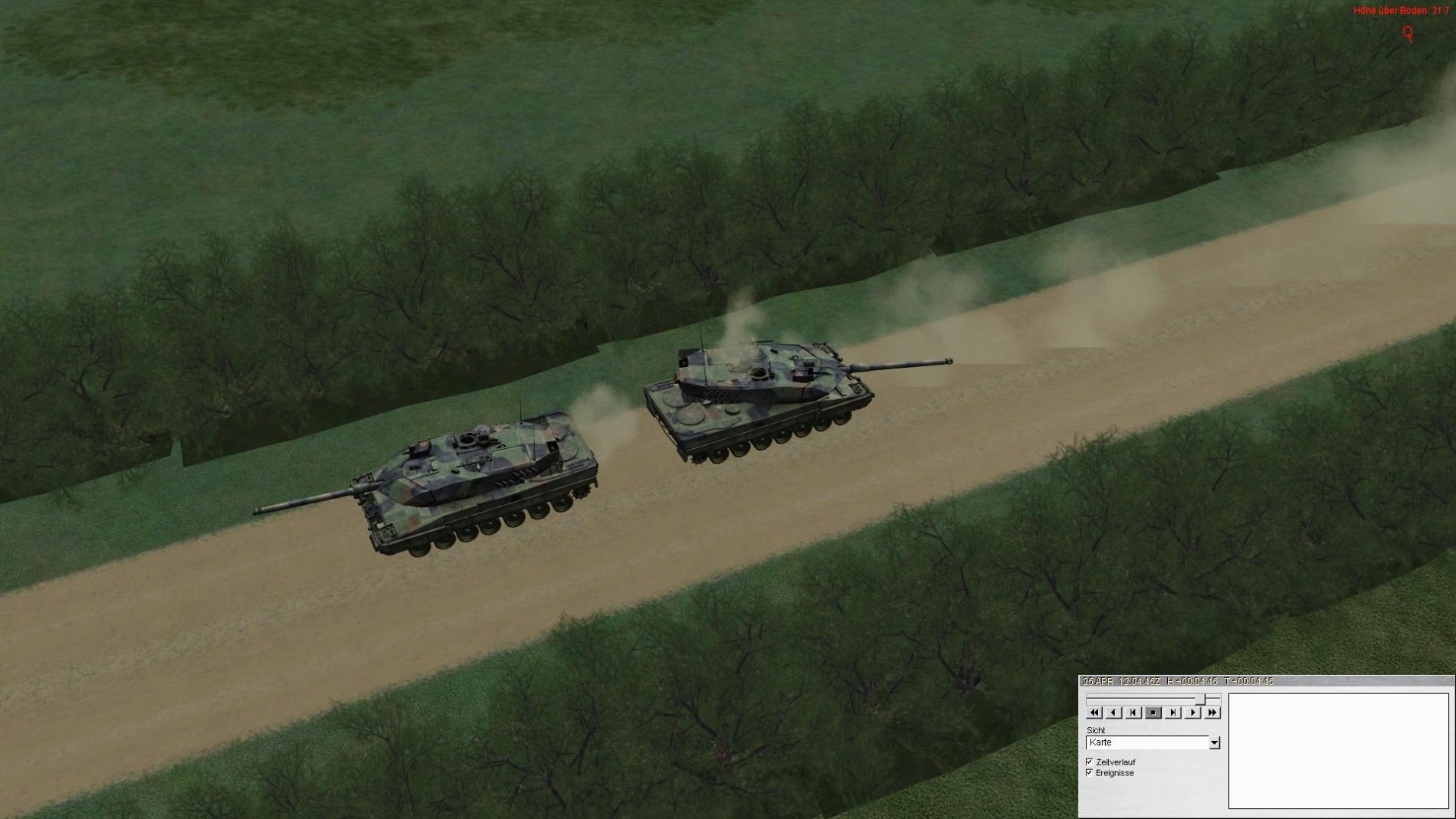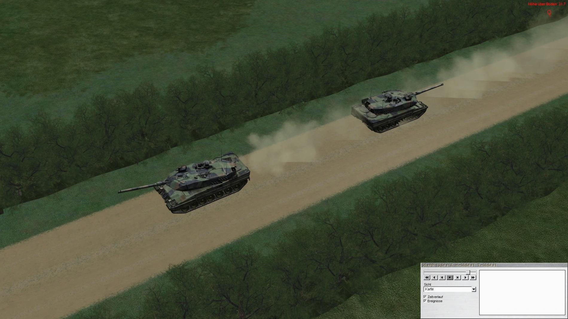 - Geschwindigkeit: Gibt man dem abschleppenden Fz per Pfad eine Geschwindigkeit vor (langsam, mittel, schnell) so fährt es diese mit dem abgeschleppten Fz auch, bremst in Kurven ggf. sogar ab. Ändere ich diese Geschwindigkeit aus einer Besatzungsposition oder Tastatur, so wird sie stets nur "langsam". Nur per Tastatur "C" oder Kartenbefehl kann sie wieder verändert werden.