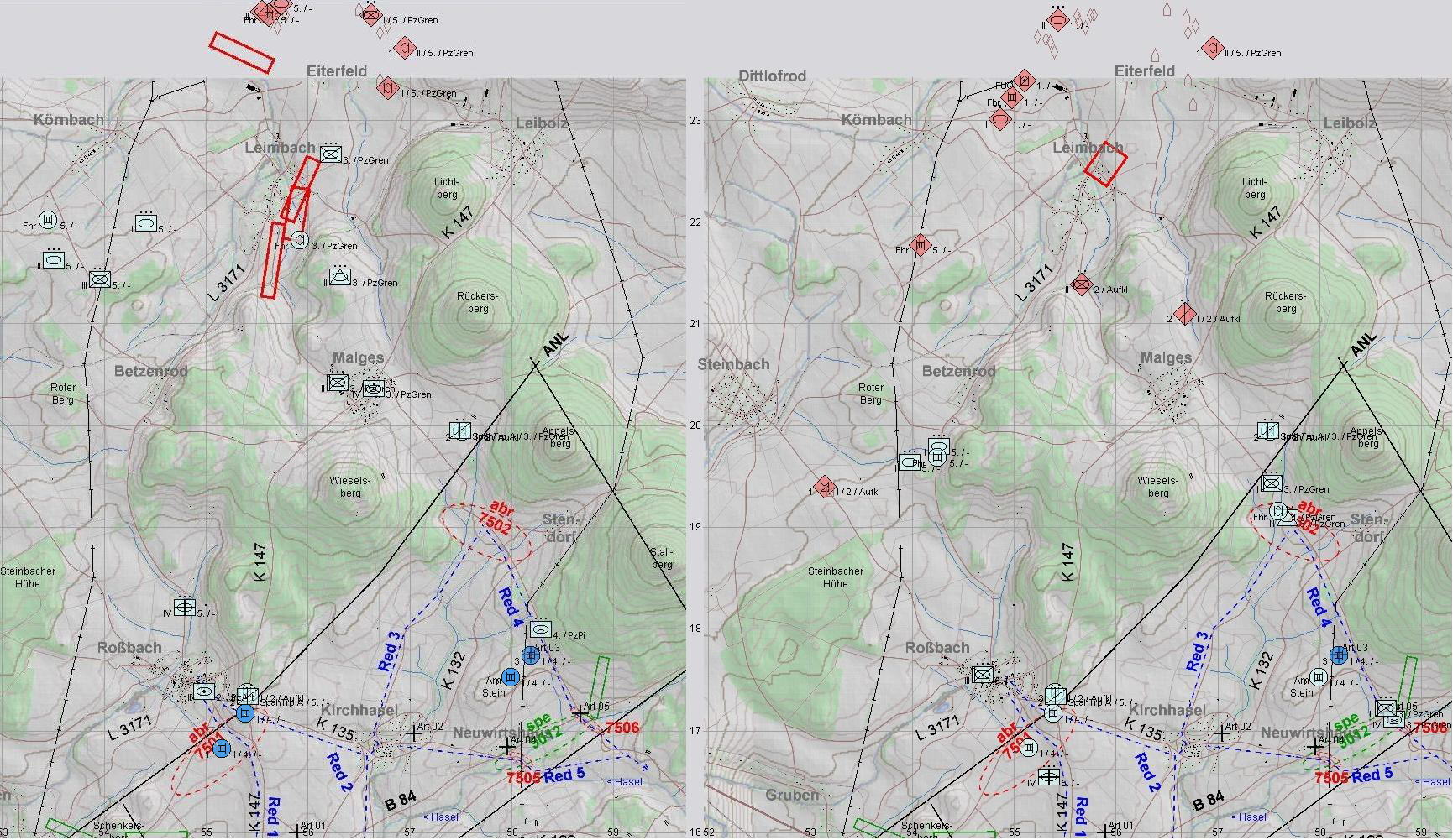 ROT greift mit je 2 PzKp und 2 BMP-Kp mit Schwerpunkt vor A und A1 an: