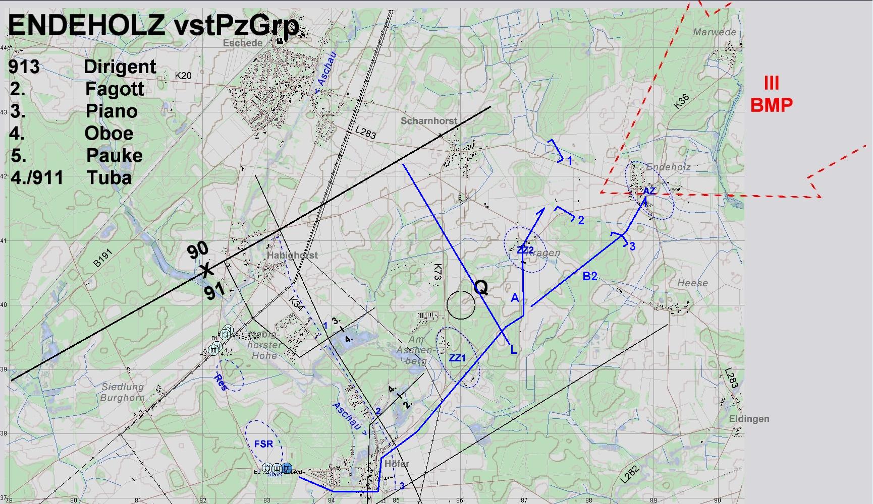 Nach Absetzen der Schützen tritt B2 auf ENDEHOLZ an, trifft auf ersten fdl. SpähTrp und vernichtet diesen: