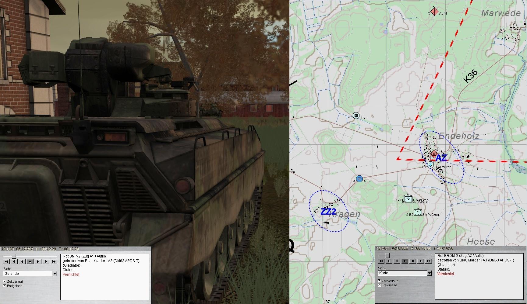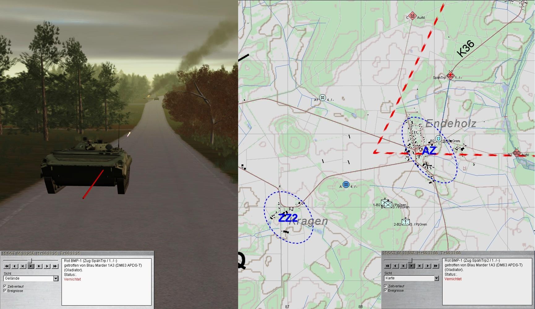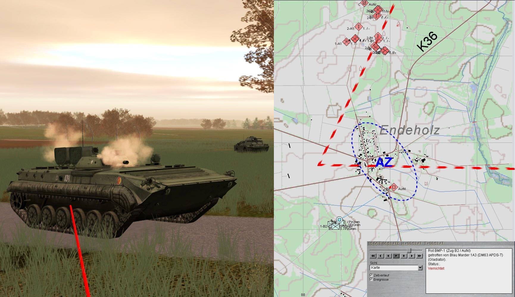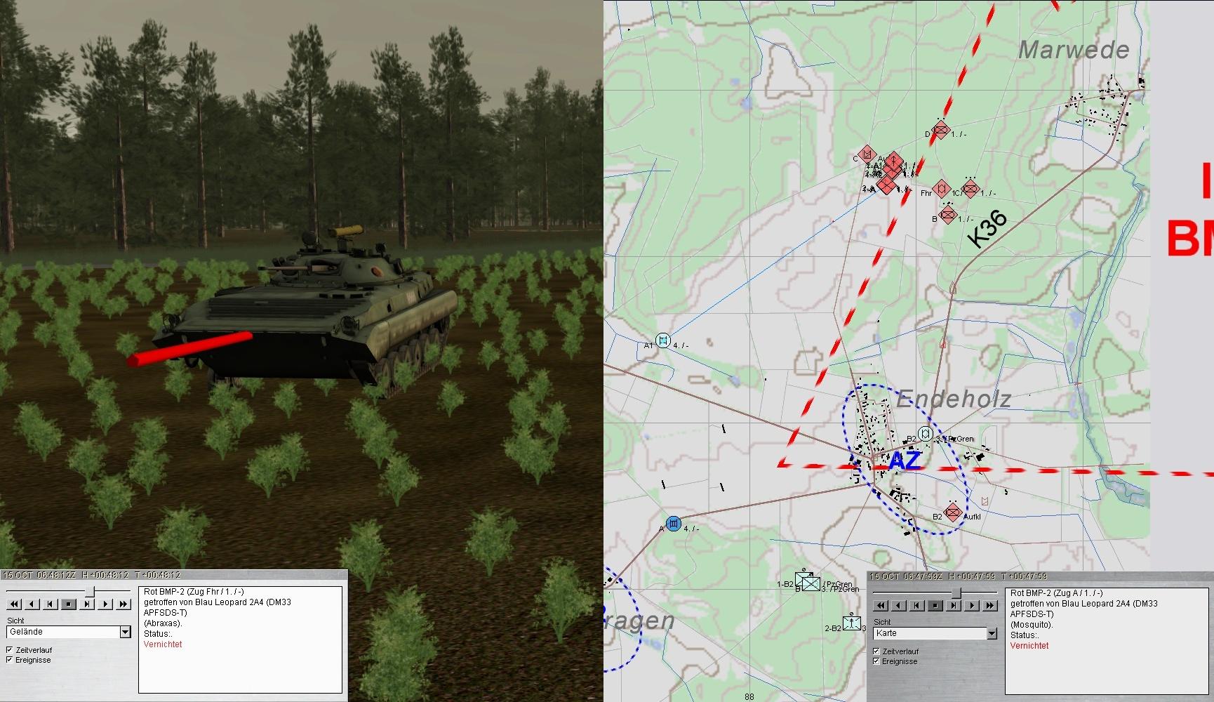 Nun greift einen BMP-Kp an, die im gemeinsamen Feuer der Leos zerschlagen wird, während B2 noch im FKpf mit fdl. Aufkl steht: