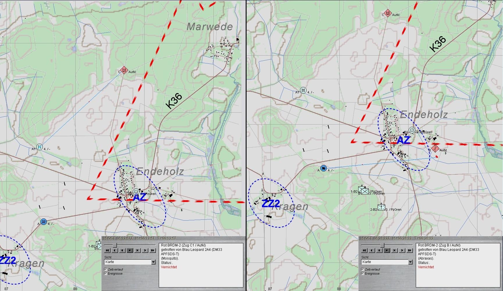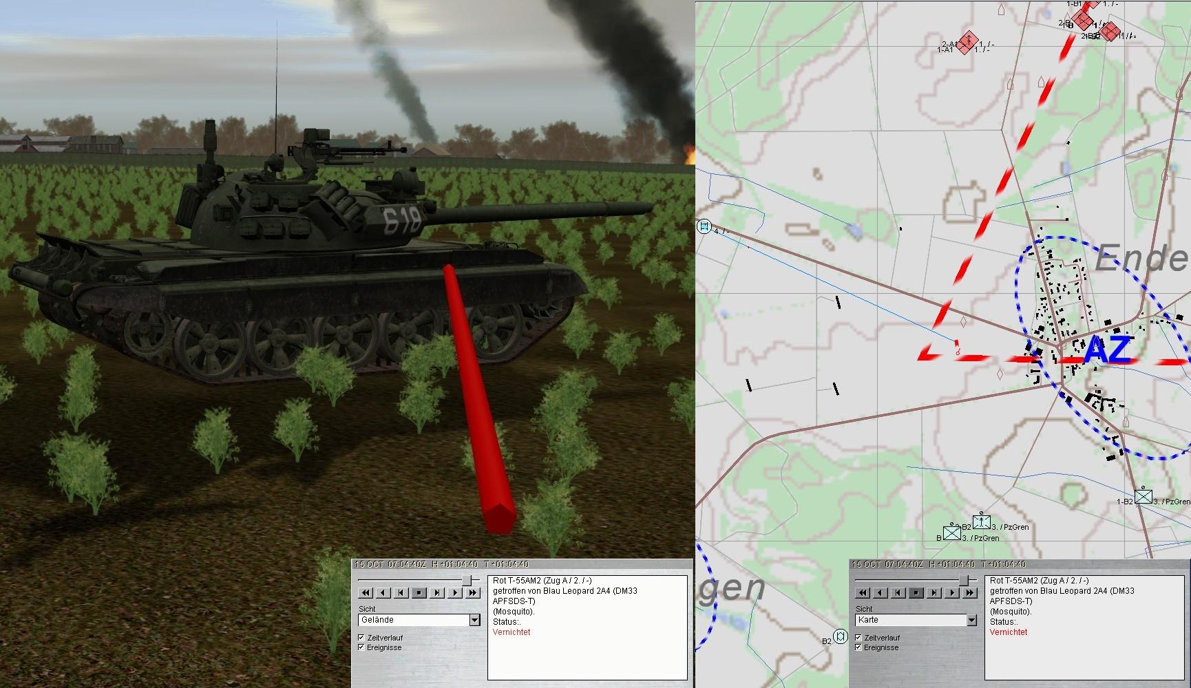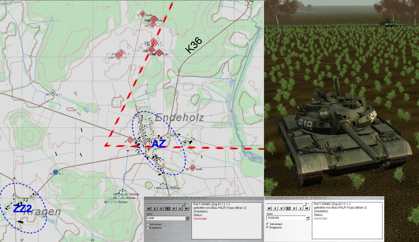 A1 bekämpft noch fdl. Schützen als ein T-55AM-Zug aus ENDEHOLZ angreift. B2 und PALR-Trp eröffnen Feuer und zuletzt A1. FdPz werden vernichtet!