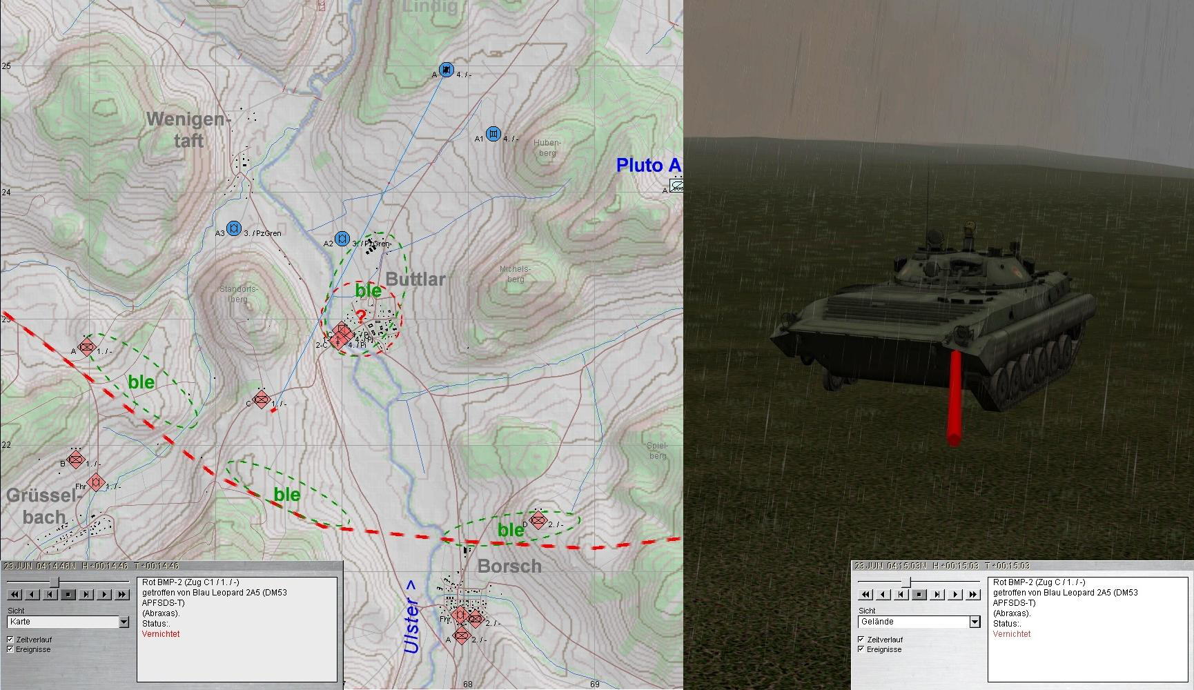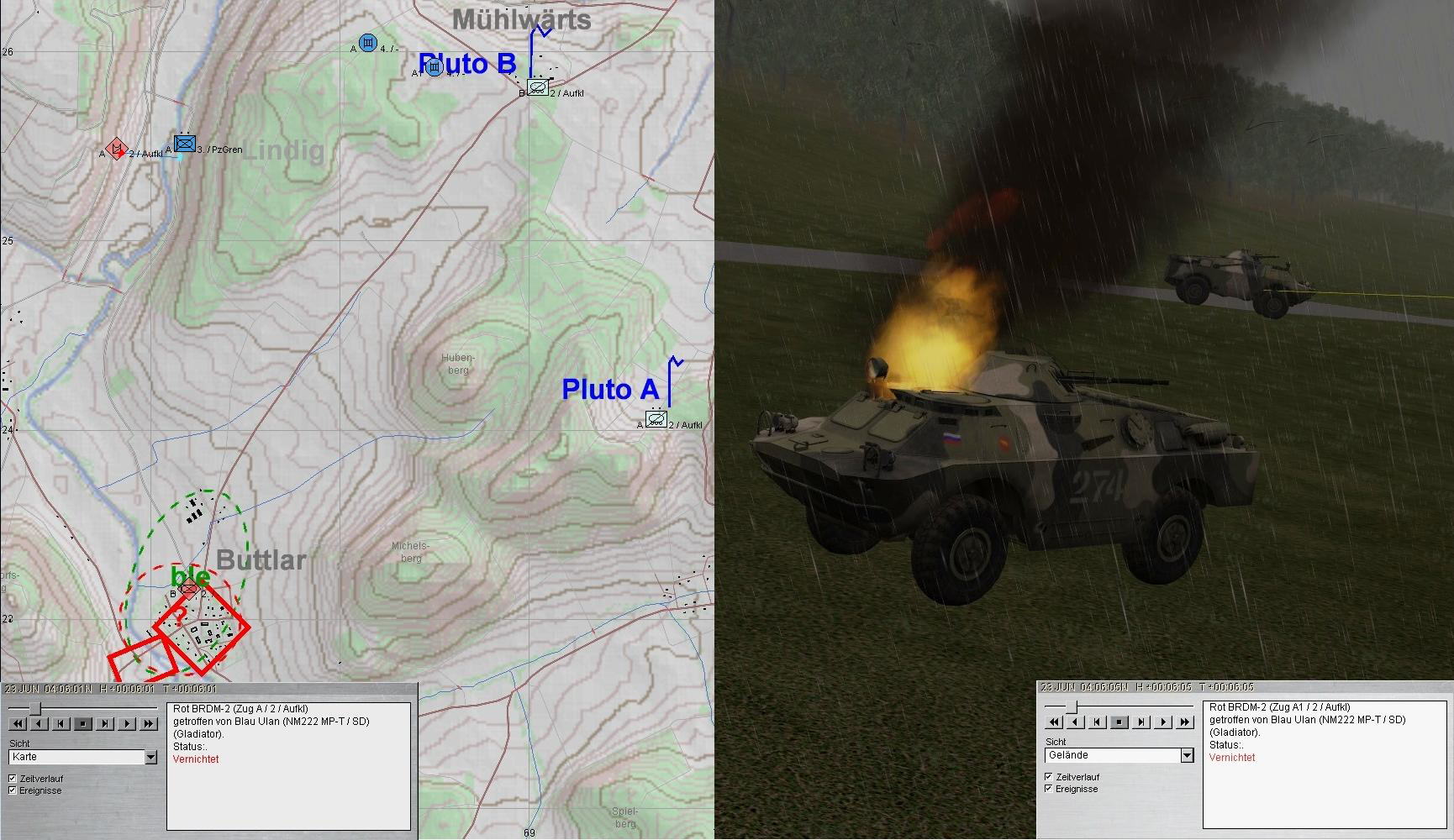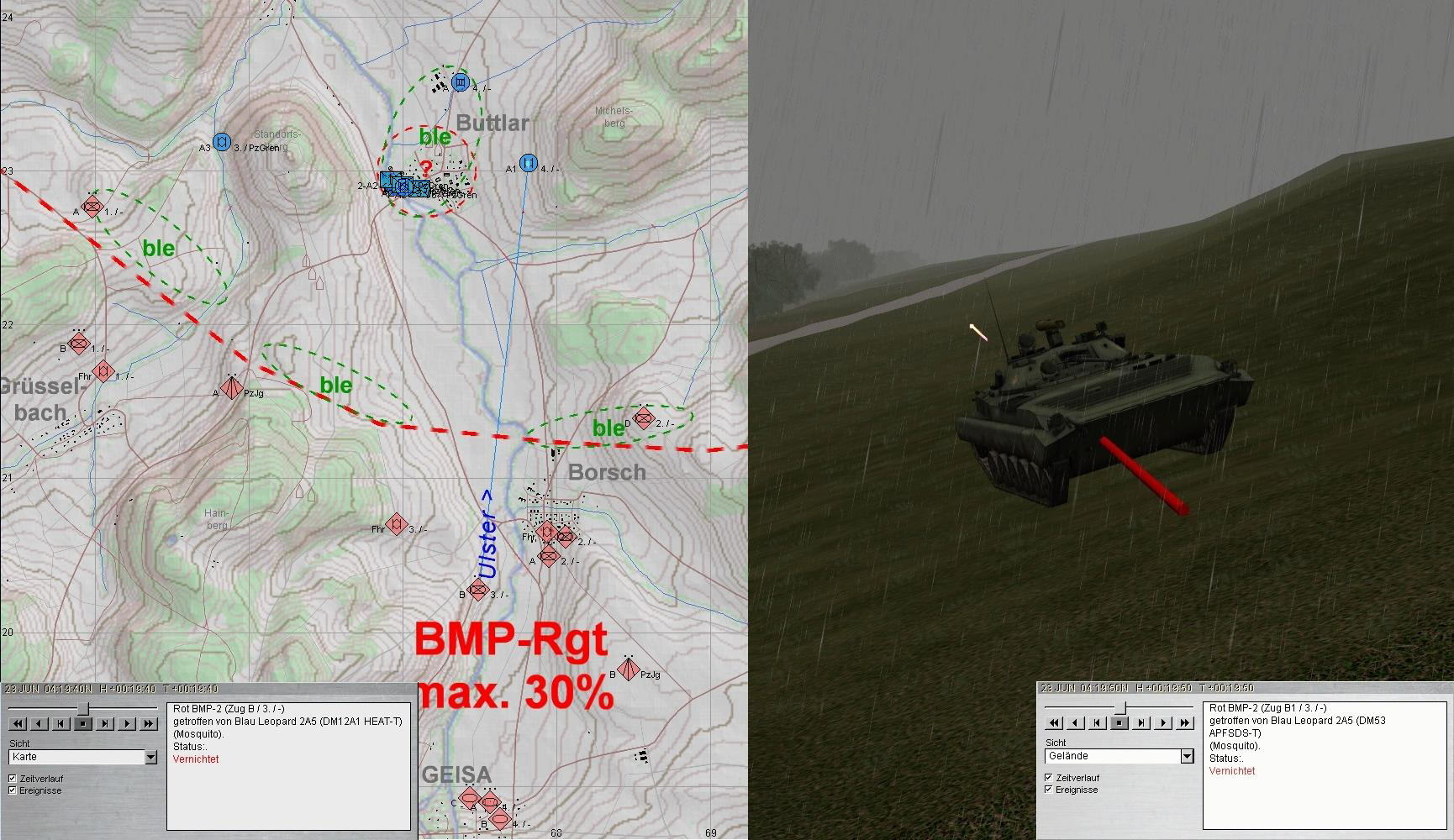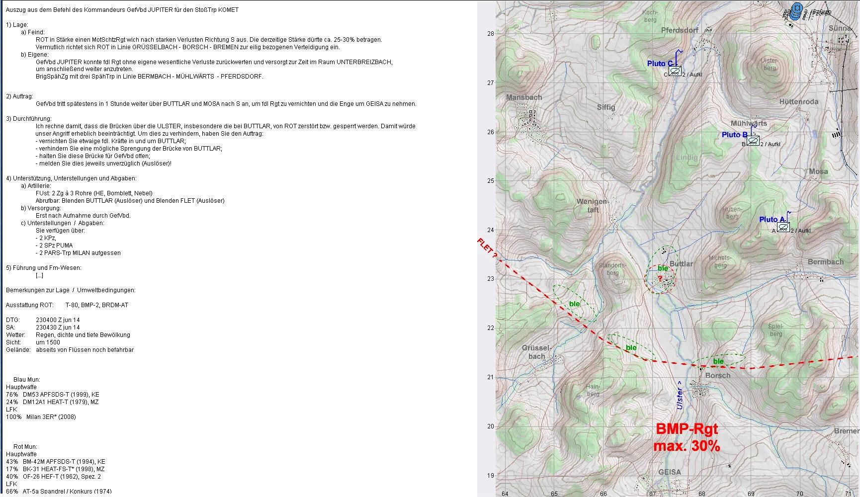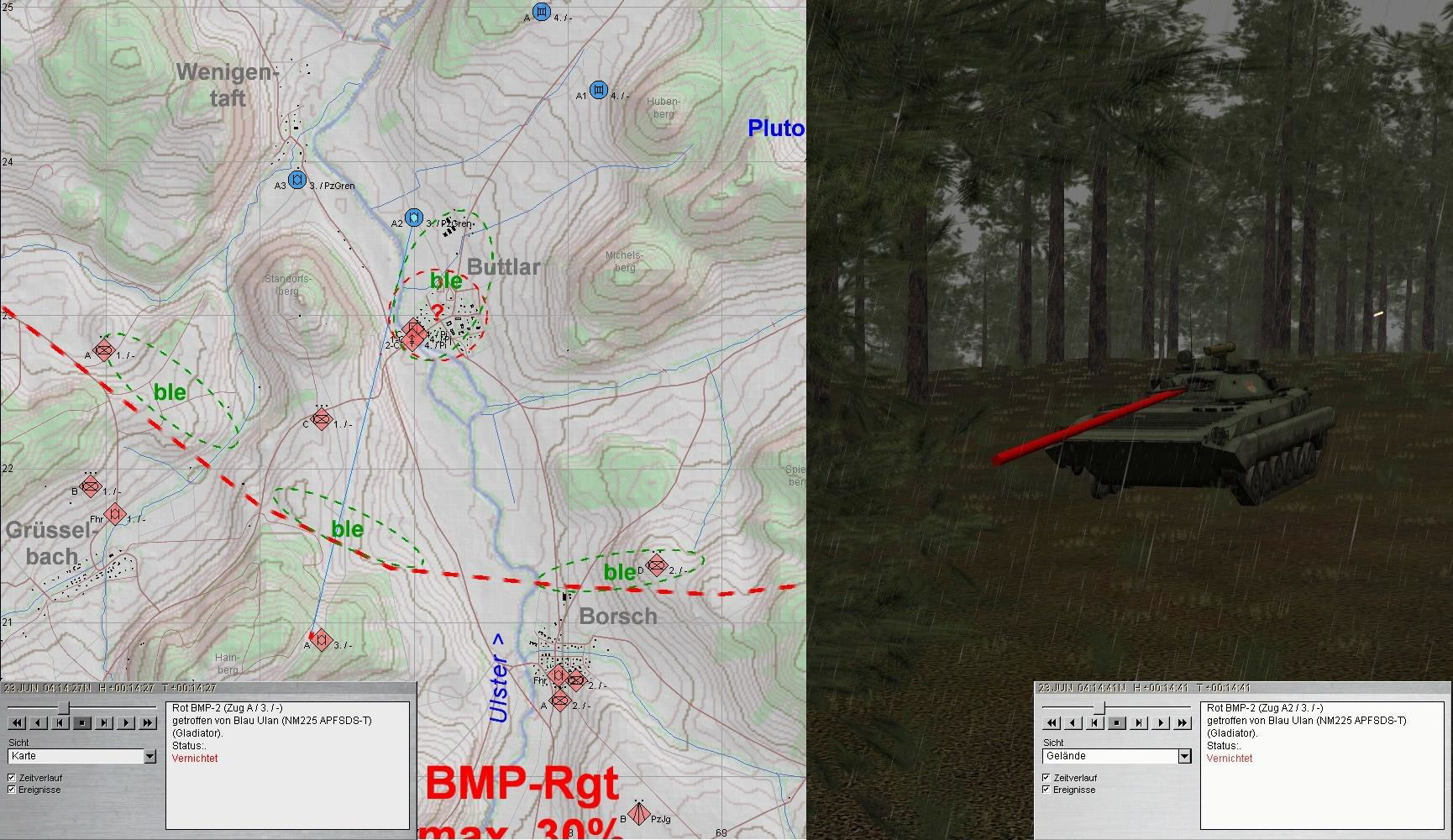 A plante mit beiden PUMA im Zuge der ULSTER anzutreten und mit KPzGrp über MÜHLWÄRTS und Ostrand LINDIG auf BUTTLAR anzutreten. PzGren traf auf fdl. Aufklärung und A+A1 auf BMP in BUTTLAR: