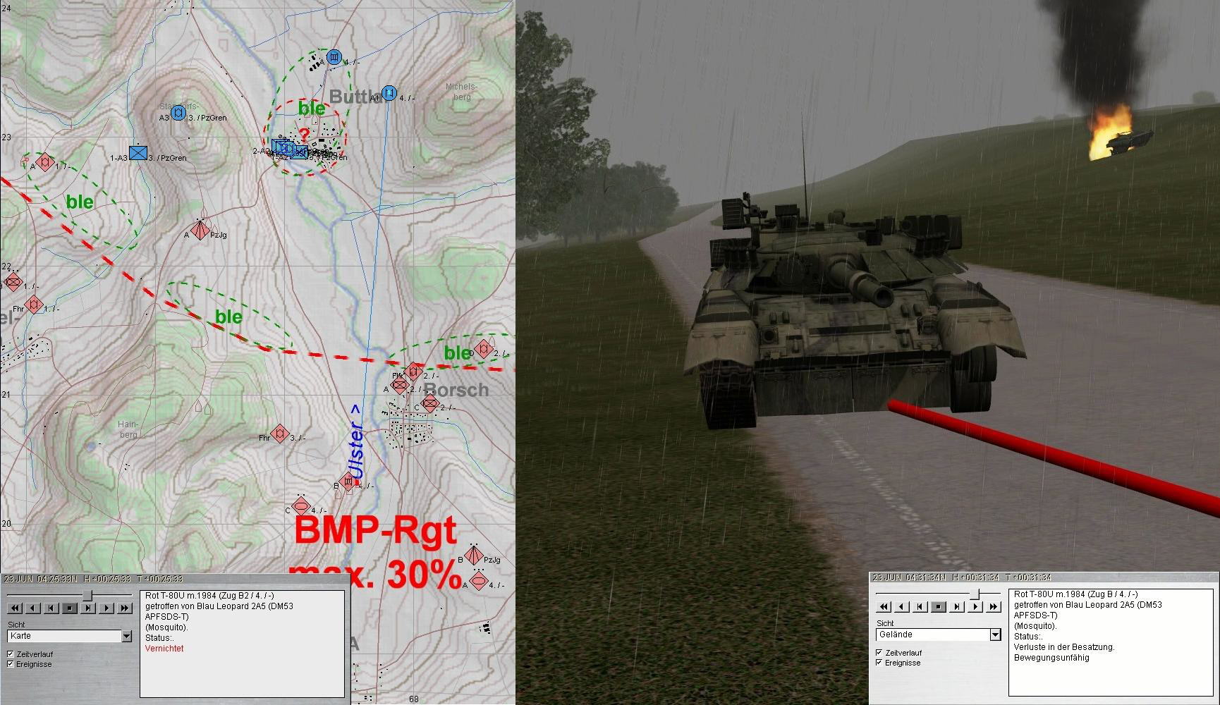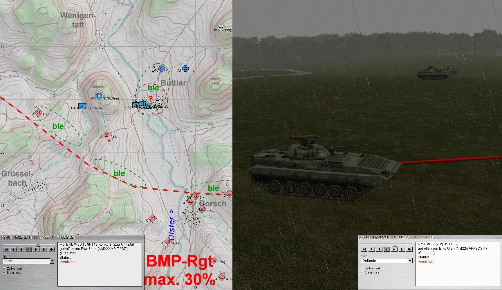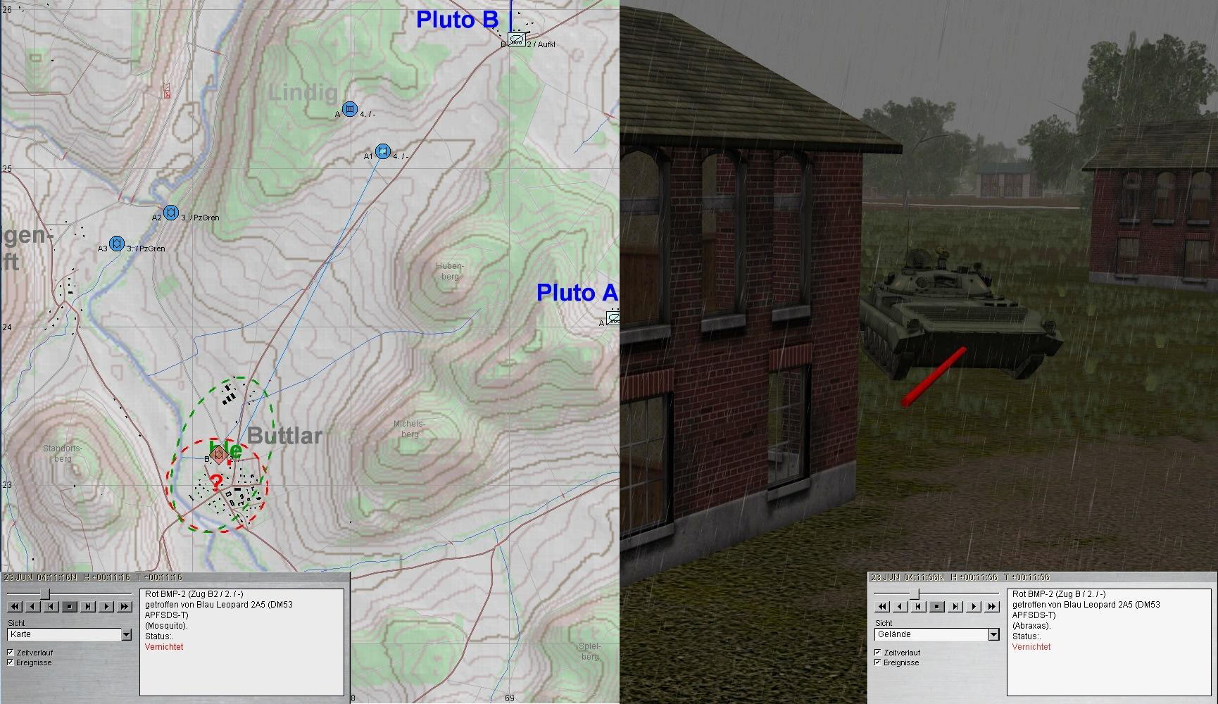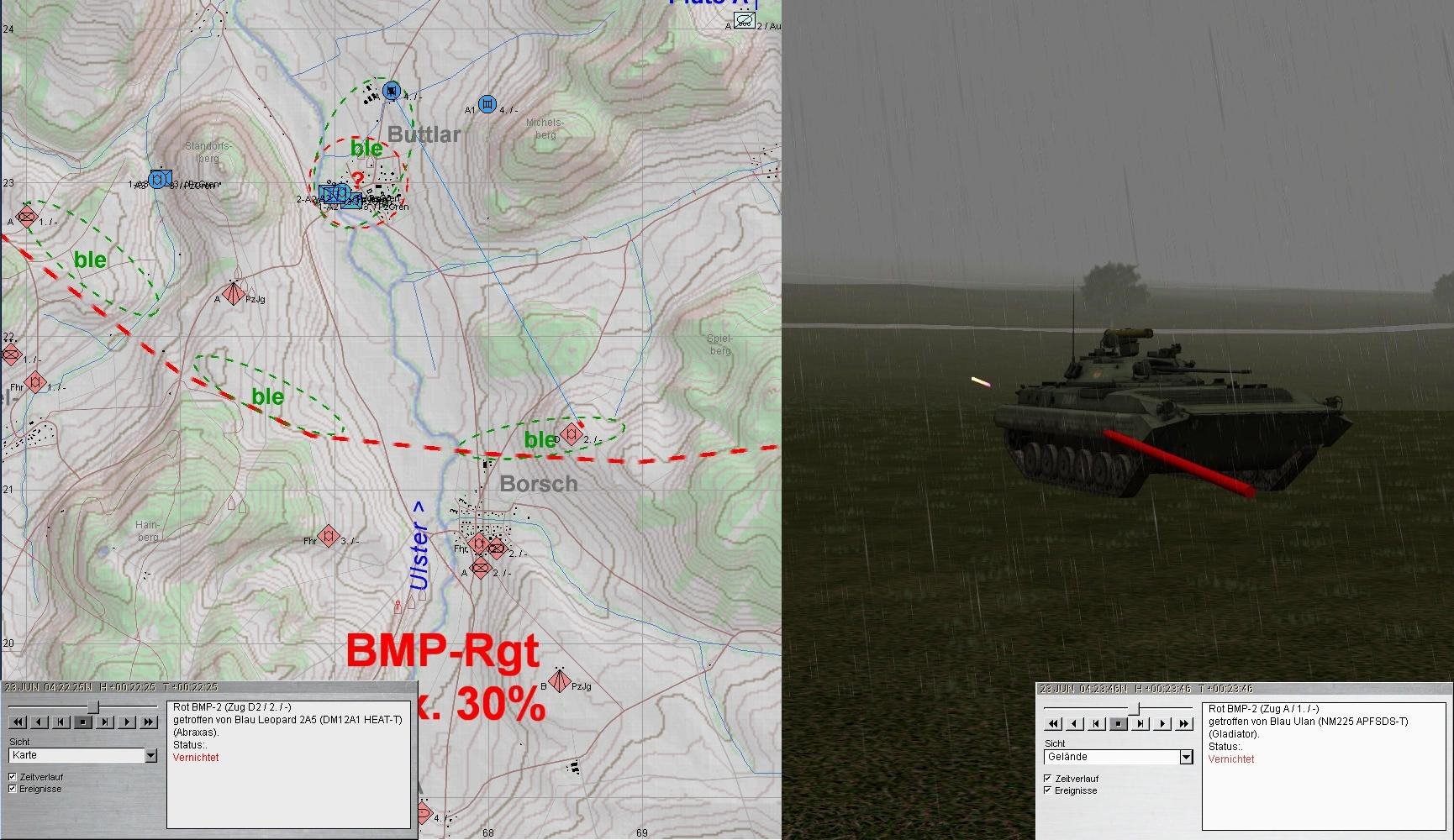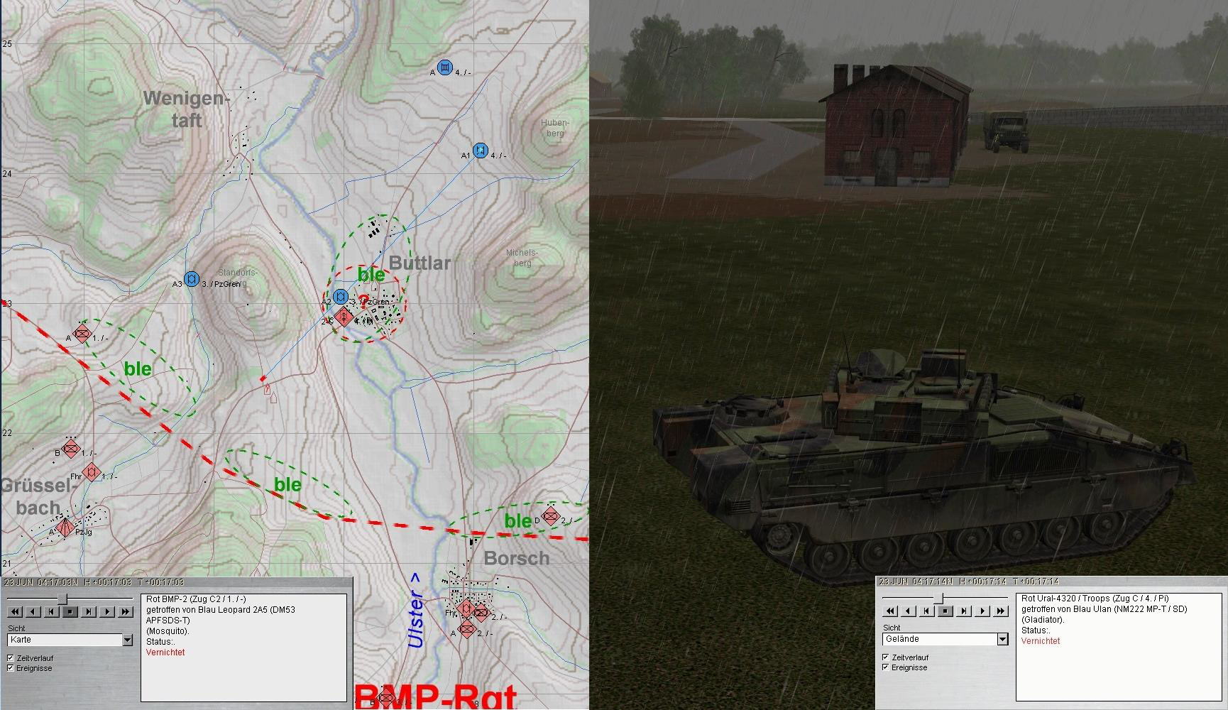 A plante mit beiden PUMA im Zuge der ULSTER anzutreten und mit KPzGrp über MÜHLWÄRTS und Ostrand LINDIG auf BUTTLAR anzutreten. PzGren traf auf fdl. Aufklärung und A+A1 auf BMP in BUTTLAR: