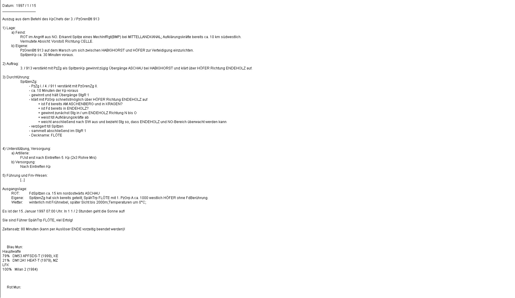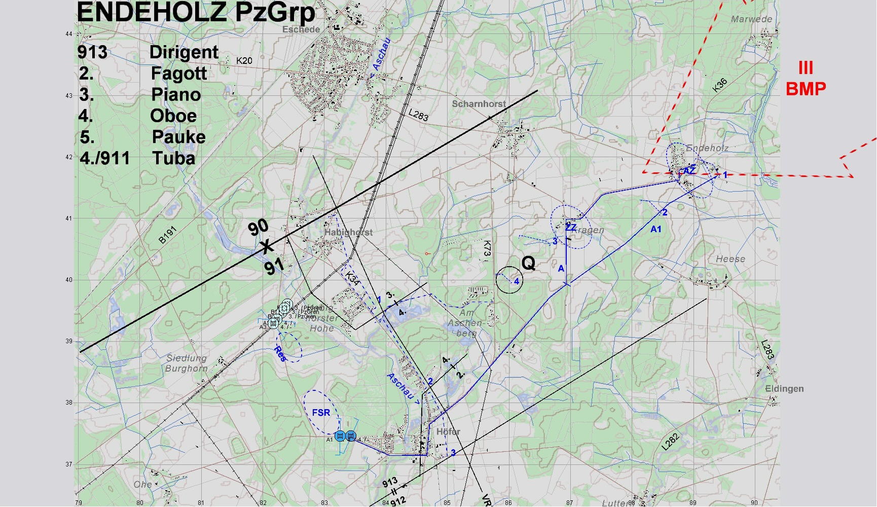 Pläne ersetzen den Zufall durch Irrtum! Nun es kam etwas anders. Blieb man bis ENDEHOLZ ohne Feindberührung, so traf A im Ort auf fdl SpähTrp und vernichtete diesen: