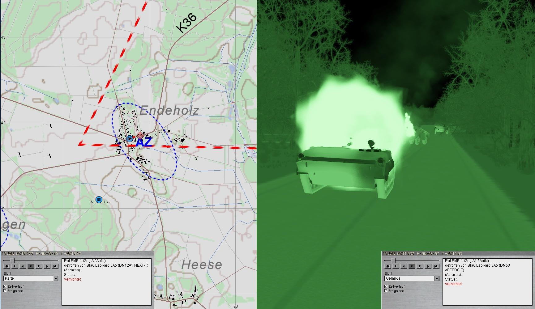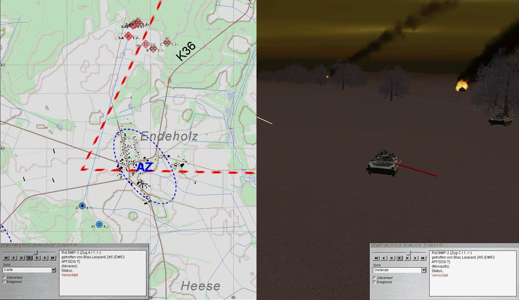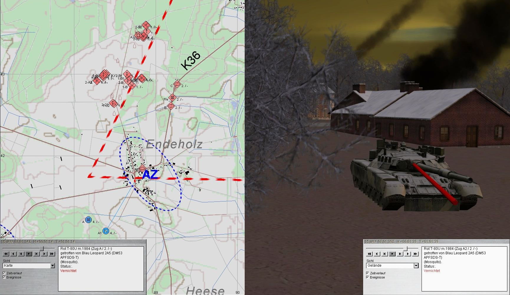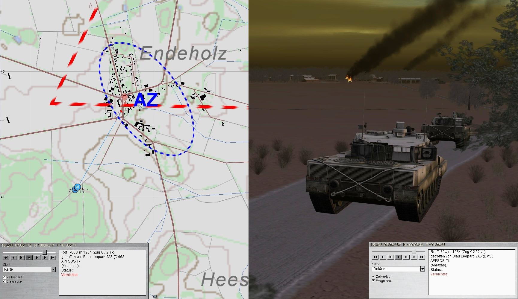 Wie es sich anbahnte, so trat eine BMP-2-Kp nordwestlich ENDEHOLZ an. A und A1 führten erfolgreich den Feuerkampf. Aber da rückte noch eine T-80-Kp an: