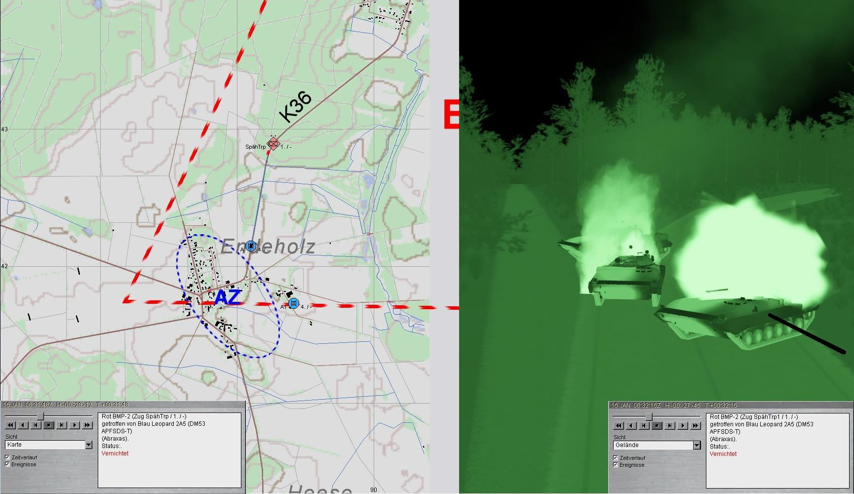 Nach Erreichen der Stellung 1 dauerte es Minuten bis fdl GefAufkl, ein BMP-2-Zug auf der K36 erschien und vernichtet wurde. A und A1 wichen daraufhinh auf Stellung 2 aus: