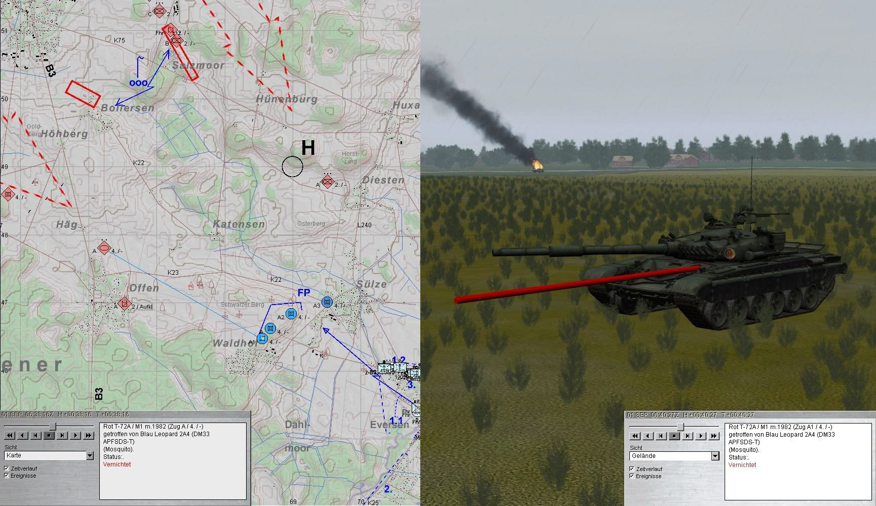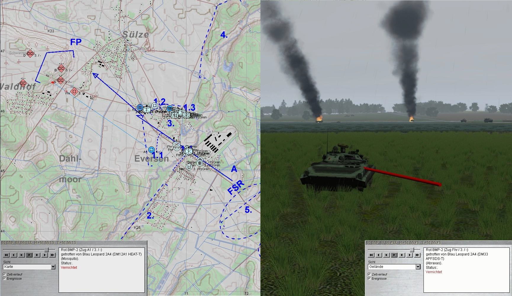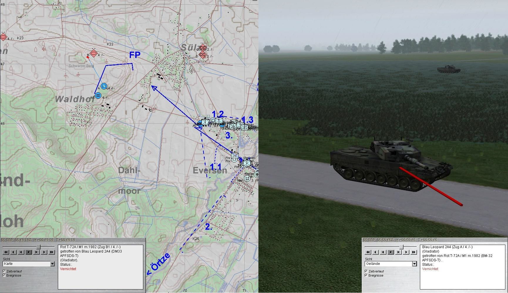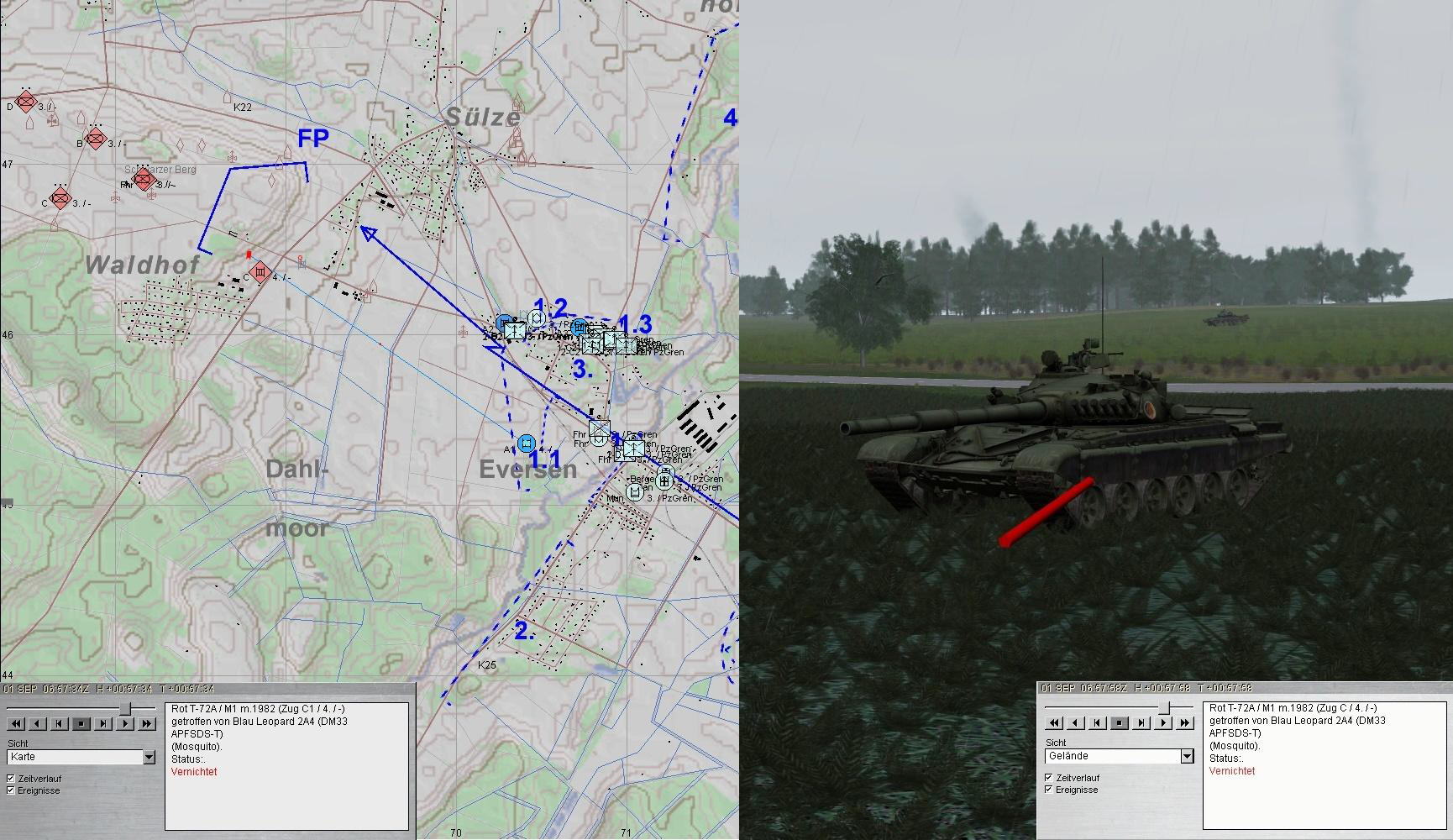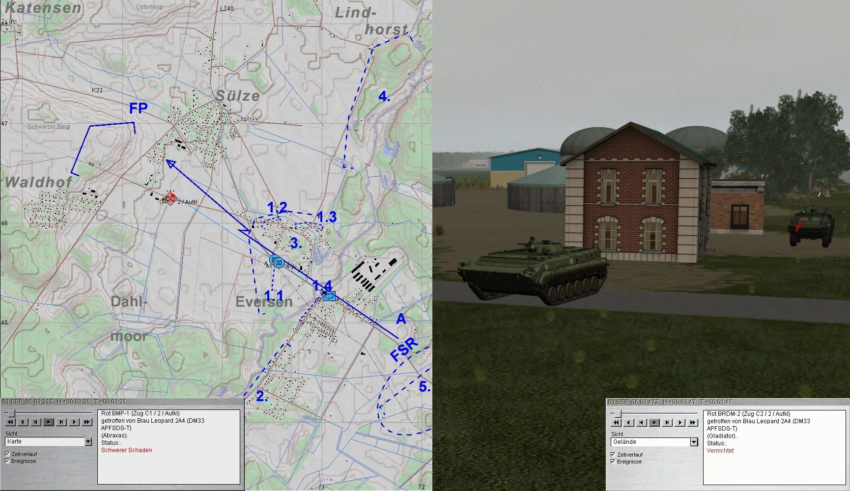 A und A1 führten weiter den Feuerkampf auf T-72-Kp, mussten jedoch ausweichen. Dabei wurde A abgeschossen. A1 wich auf 1.1 aus und vernichtete die letzten T-72. Gladiator erhielt den A3.