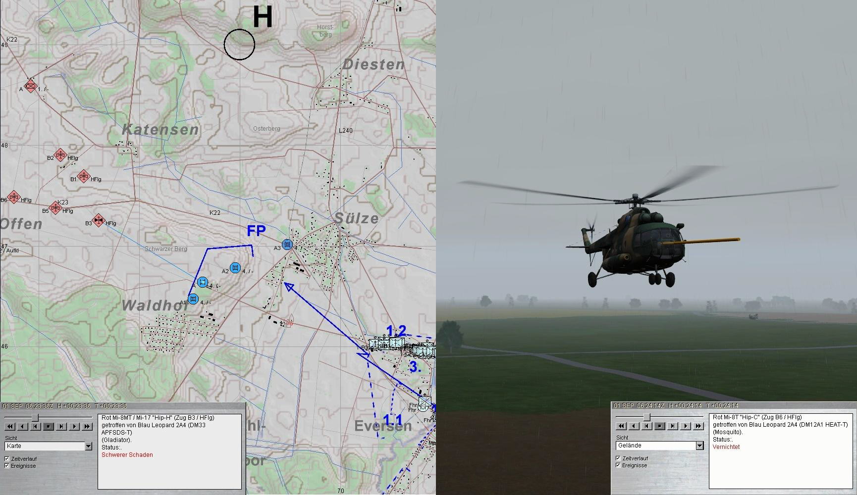 ALBERICH B meldet Feindhubschrauber. Während die PzGrenKp in Stellung ging, gelang es A-Zg die Helis im Anflug zu vernichten: