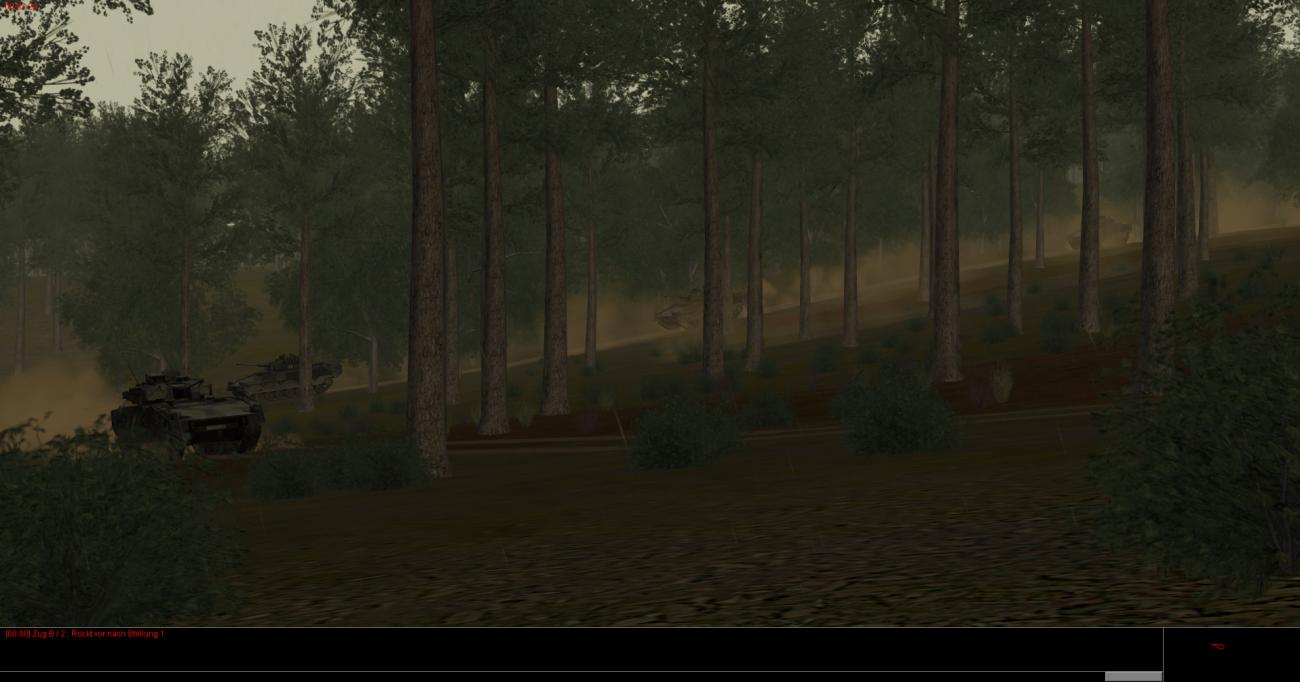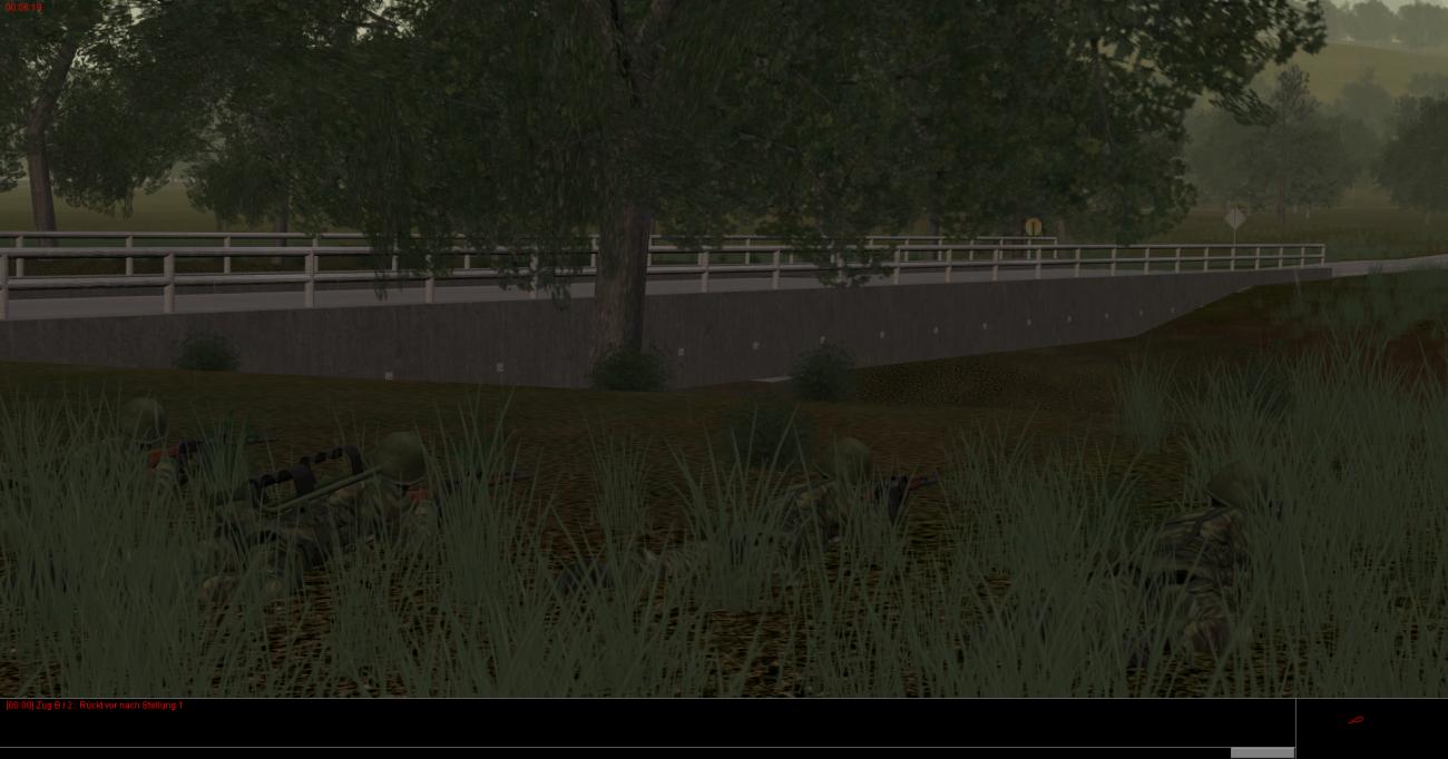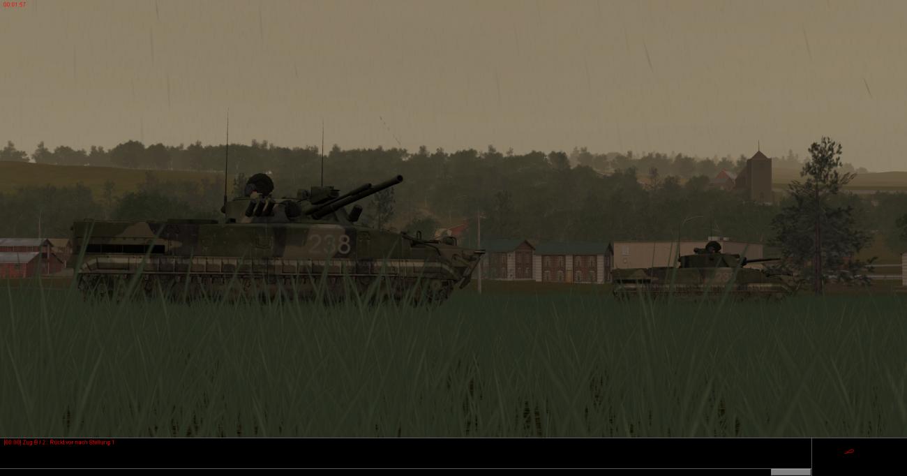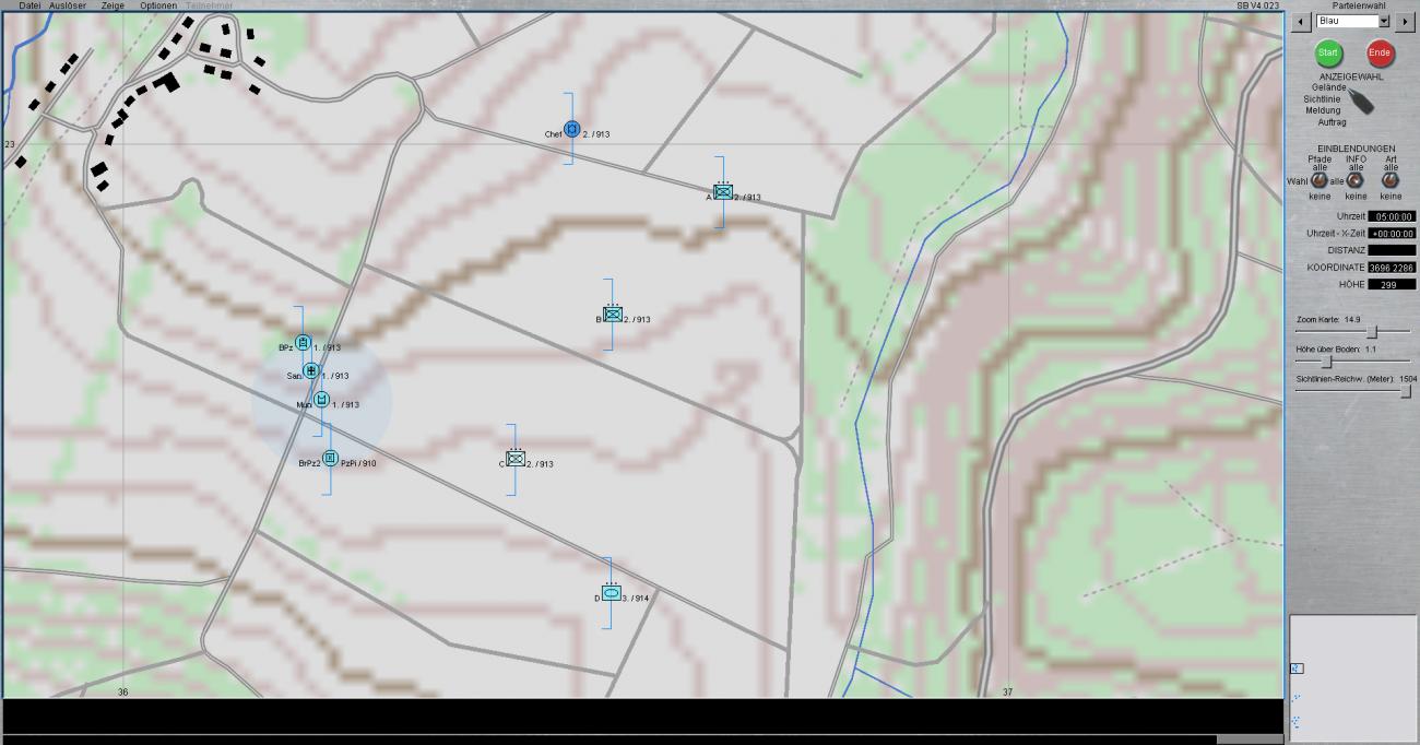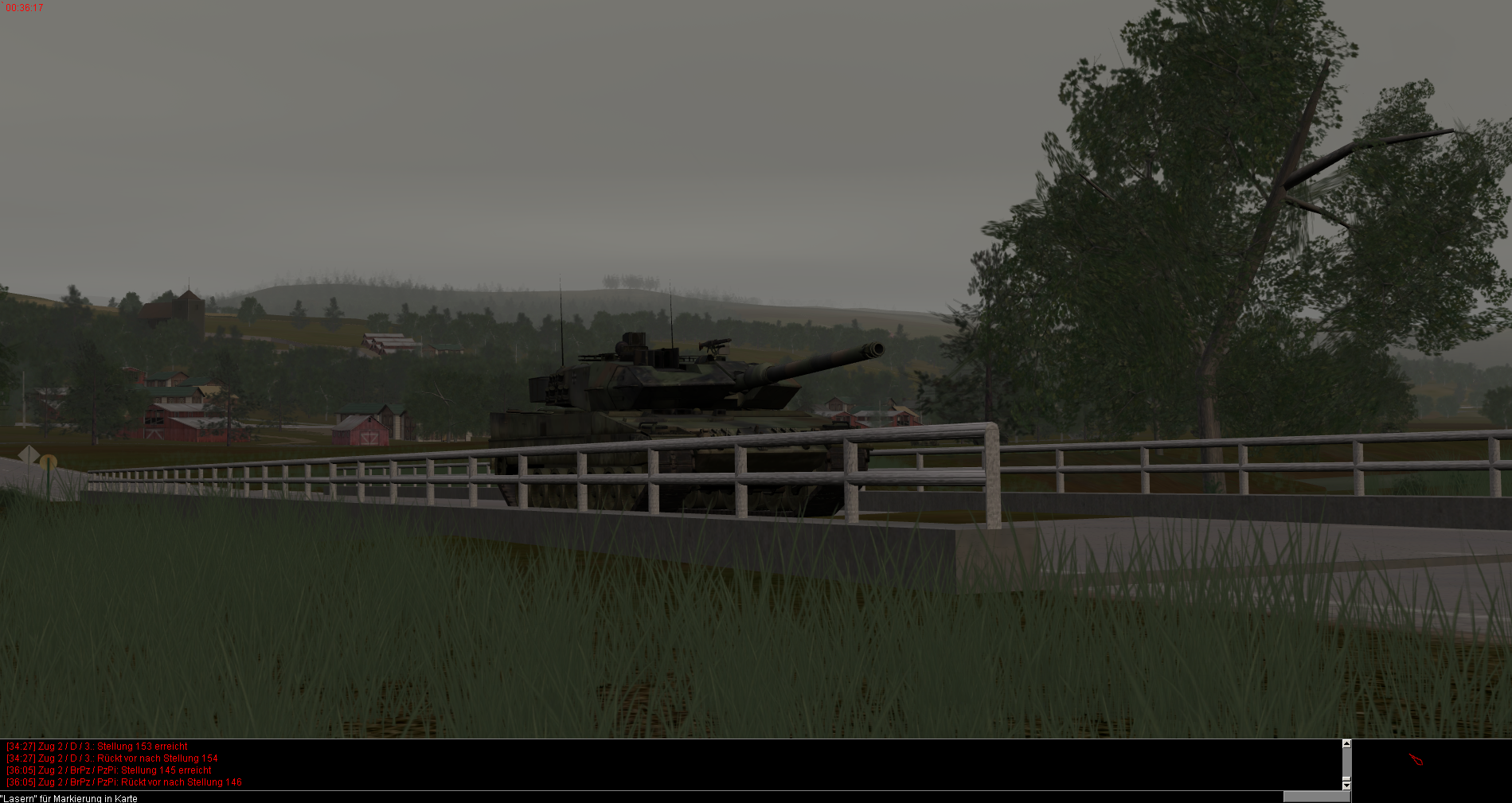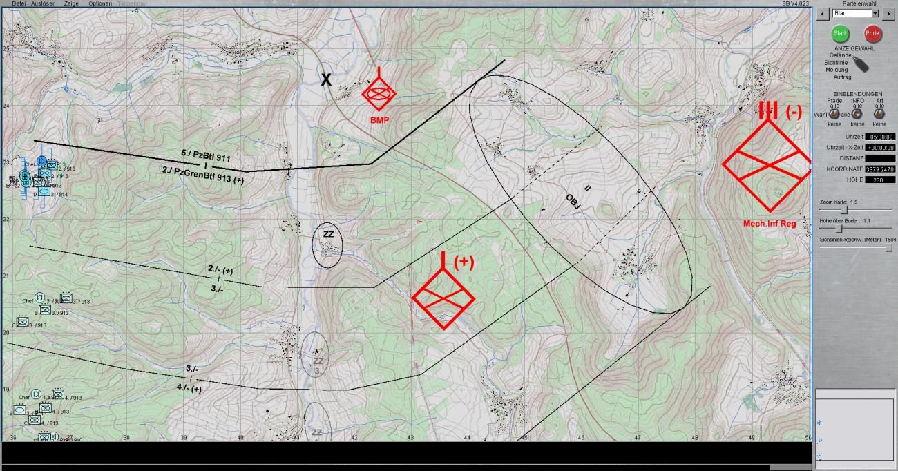 ROT in Stärke eines verm. Mech Inf Reg verzögert derzeitig mit einem verm. gem. Mech Btl entlang des Flusslaufes mit Schwerpunkt im Norden. Die Übergänge wurden dort bereits von ROT gesprengt. BLAU hat in dem Bereich erhebliche Schwierigkeiten voranzukommen. Im Süden wird ROT in min. Kp Stärke vermutet, die die Übergänge sichern.