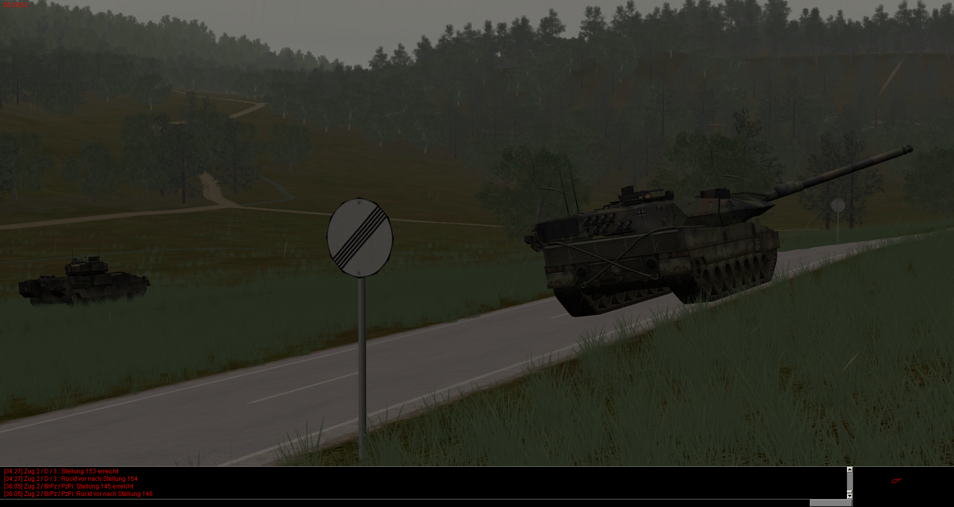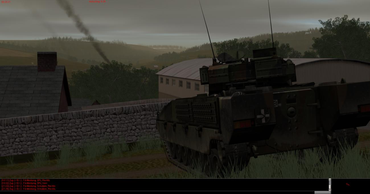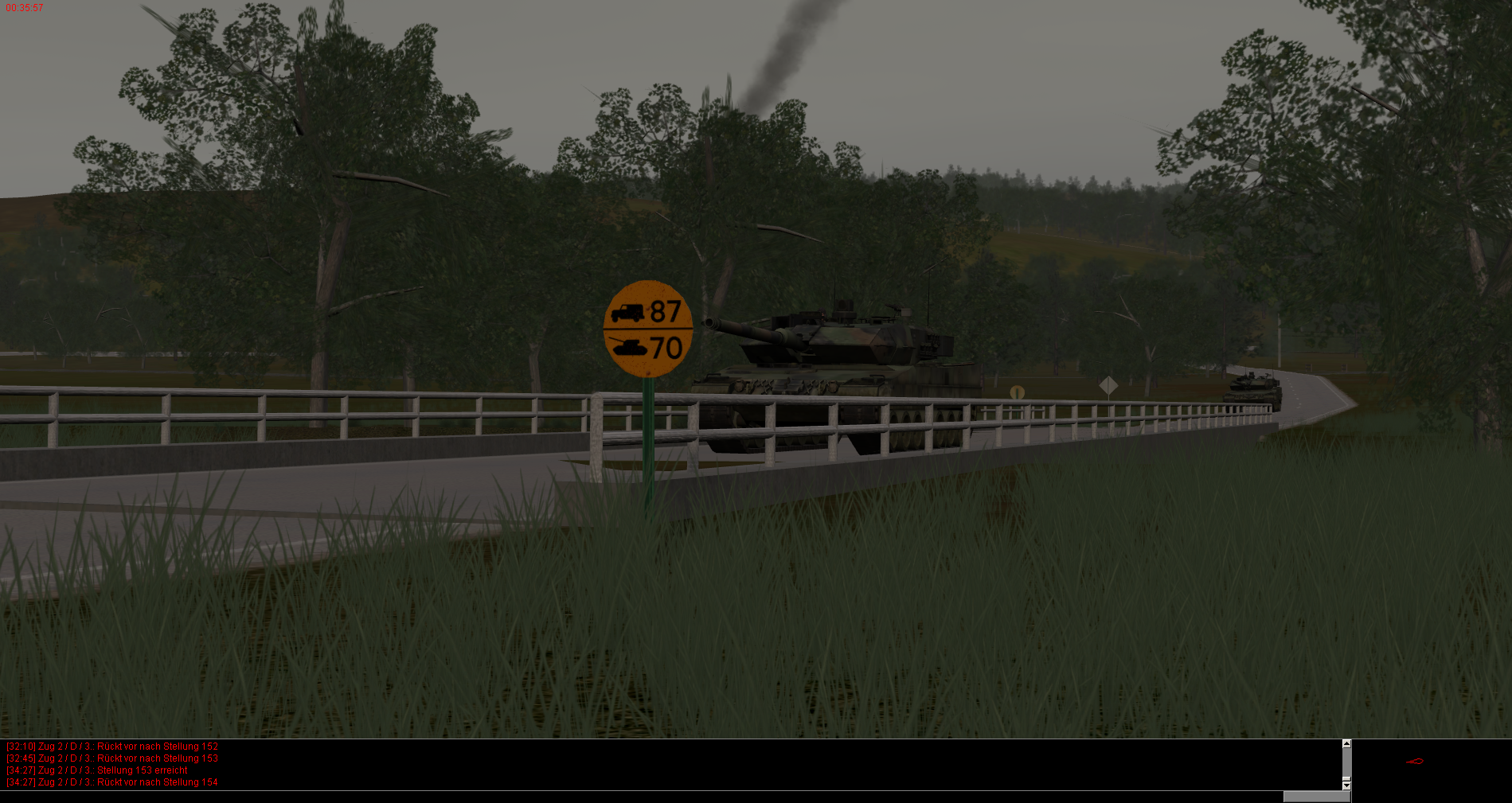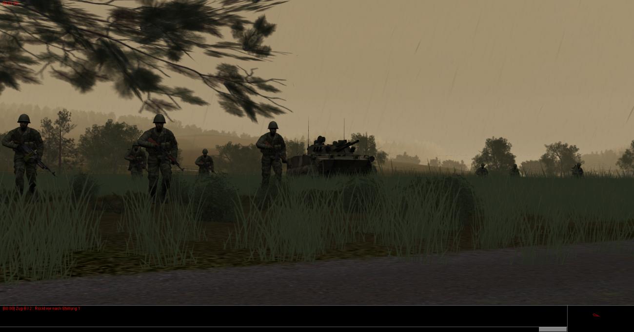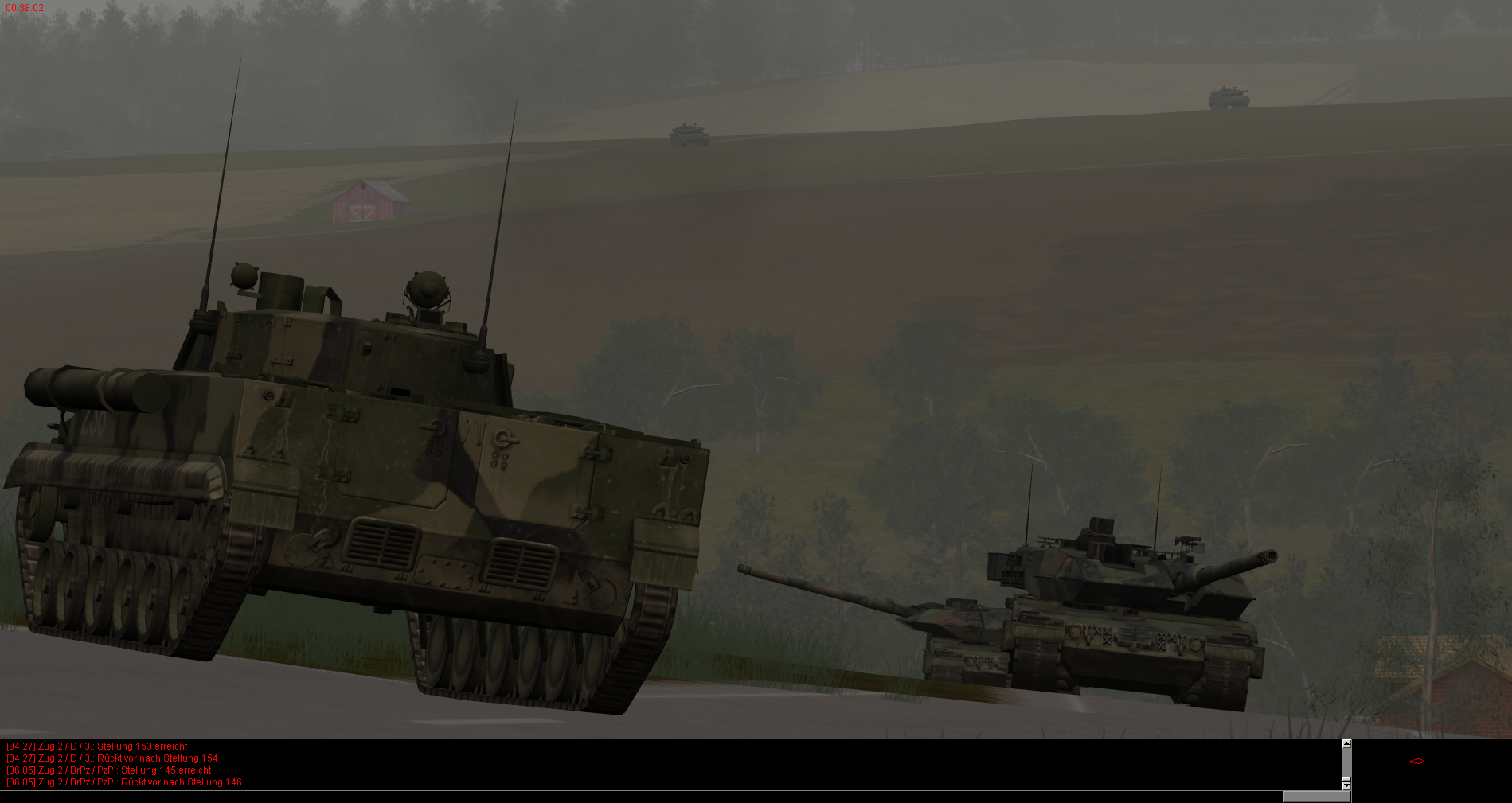 ROT in Stärke eines verm. Mech Inf Reg verzögert derzeitig mit einem verm. gem. Mech Btl entlang des Flusslaufes mit Schwerpunkt im Norden. Die Übergänge wurden dort bereits von ROT gesprengt. BLAU hat in dem Bereich erhebliche Schwierigkeiten voranzukommen. Im Süden wird ROT in min. Kp Stärke vermutet, die die Übergänge sichern.