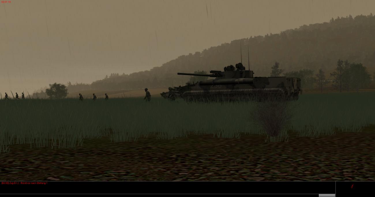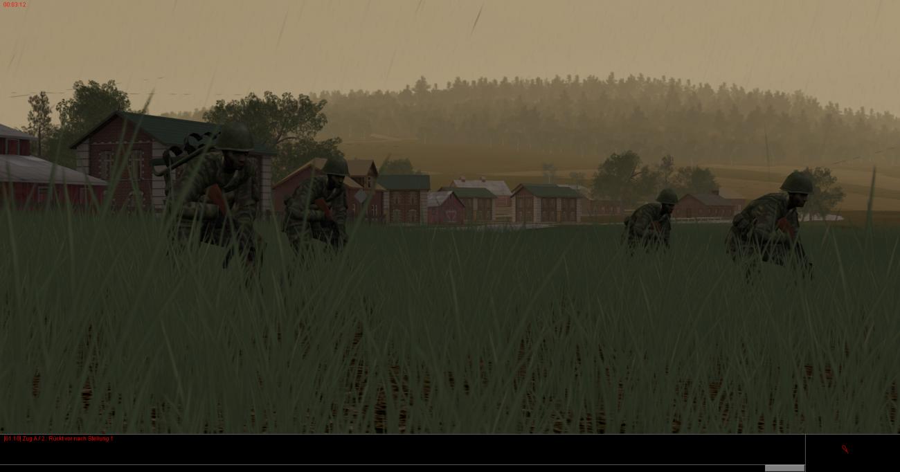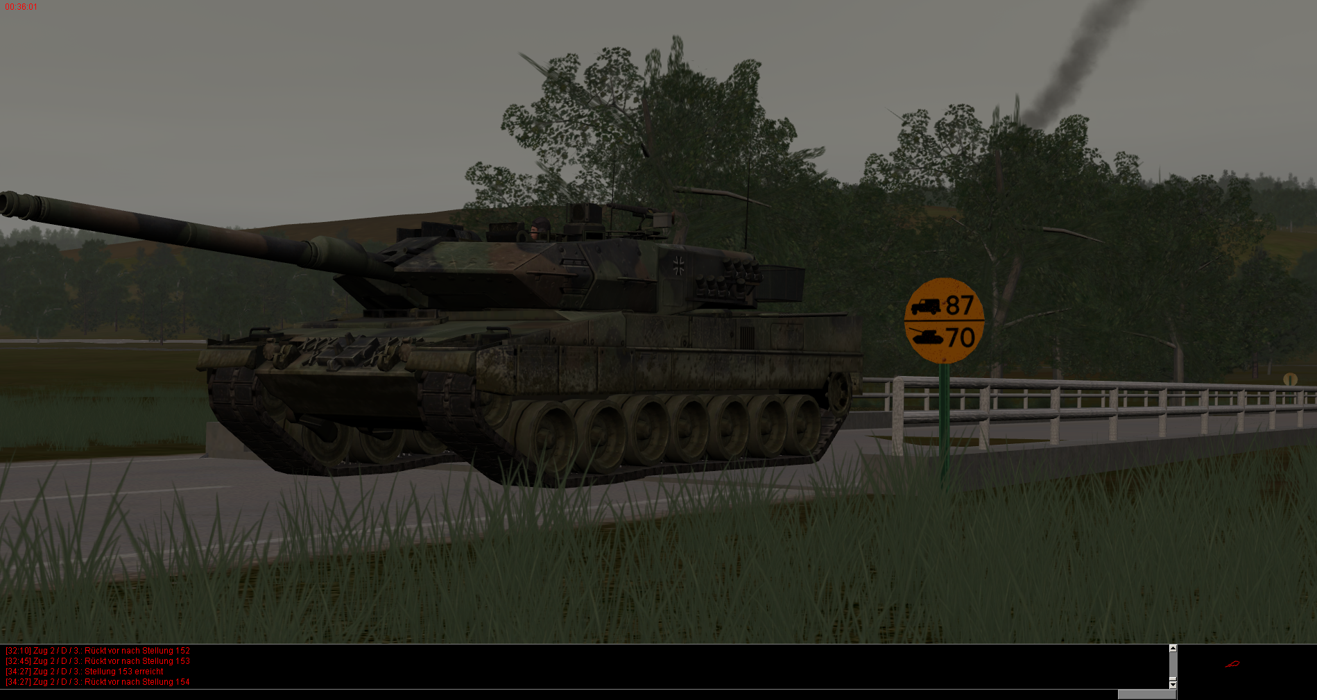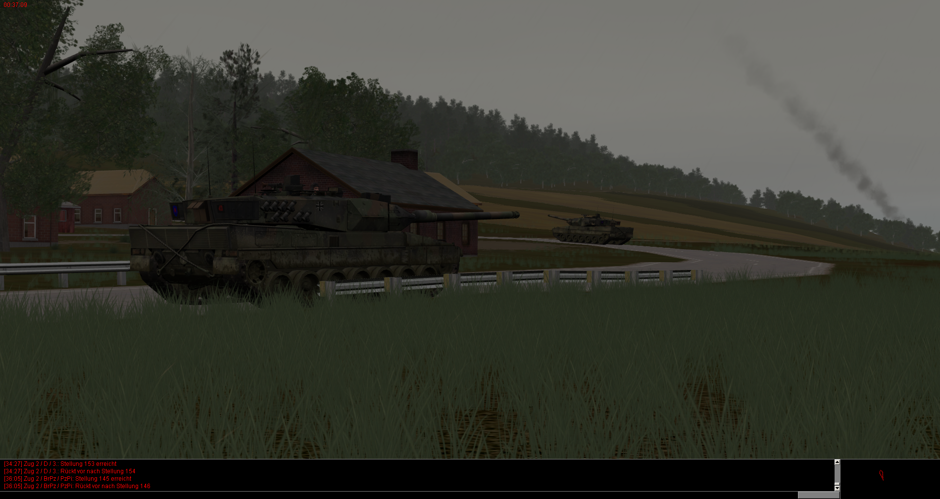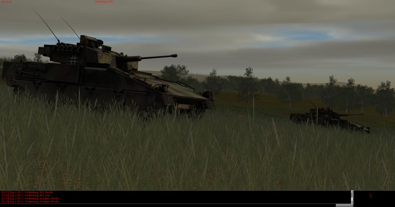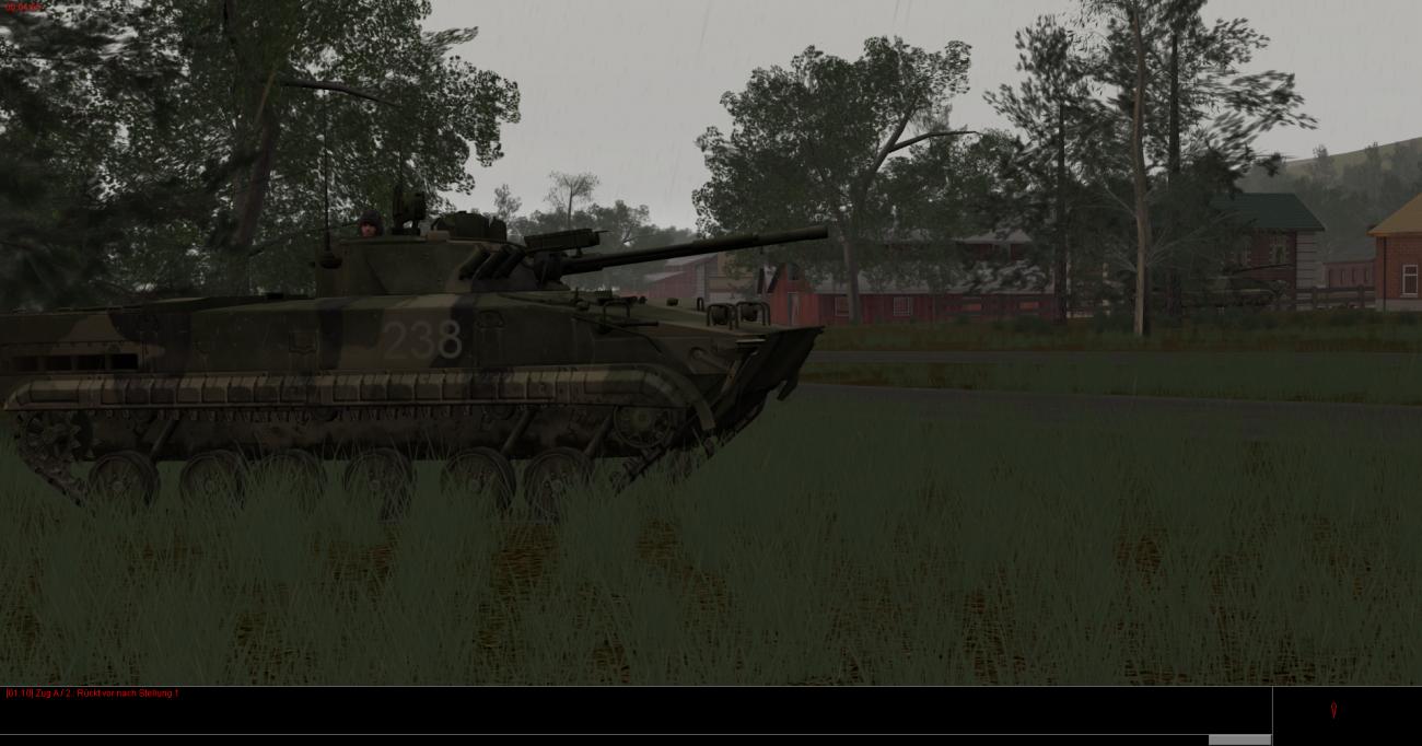 ROT in Stärke eines verm. Mech Inf Reg verzögert derzeitig mit einem verm. gem. Mech Btl entlang des Flusslaufes mit Schwerpunkt im Norden. Die Übergänge wurden dort bereits von ROT gesprengt. BLAU hat in dem Bereich erhebliche Schwierigkeiten voranzukommen. Im Süden wird ROT in min. Kp Stärke vermutet, die die Übergänge sichern.