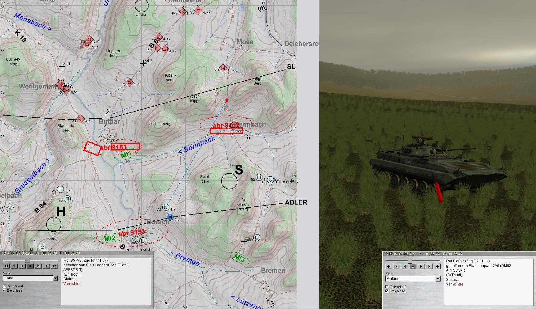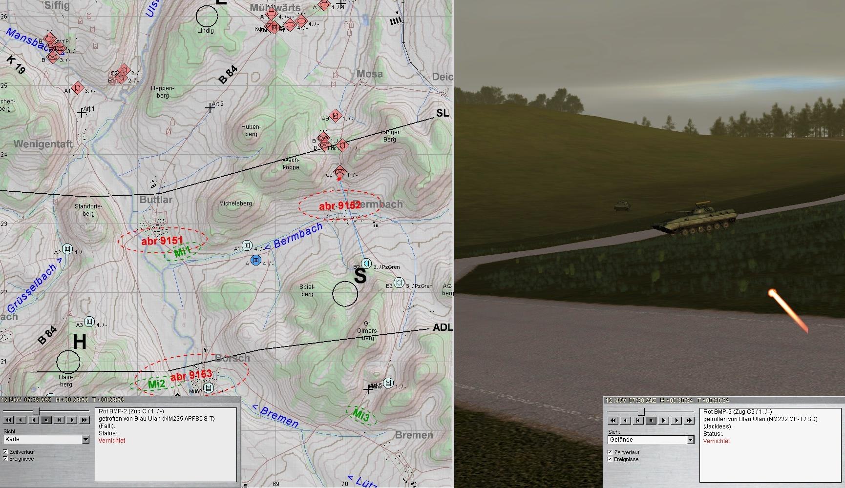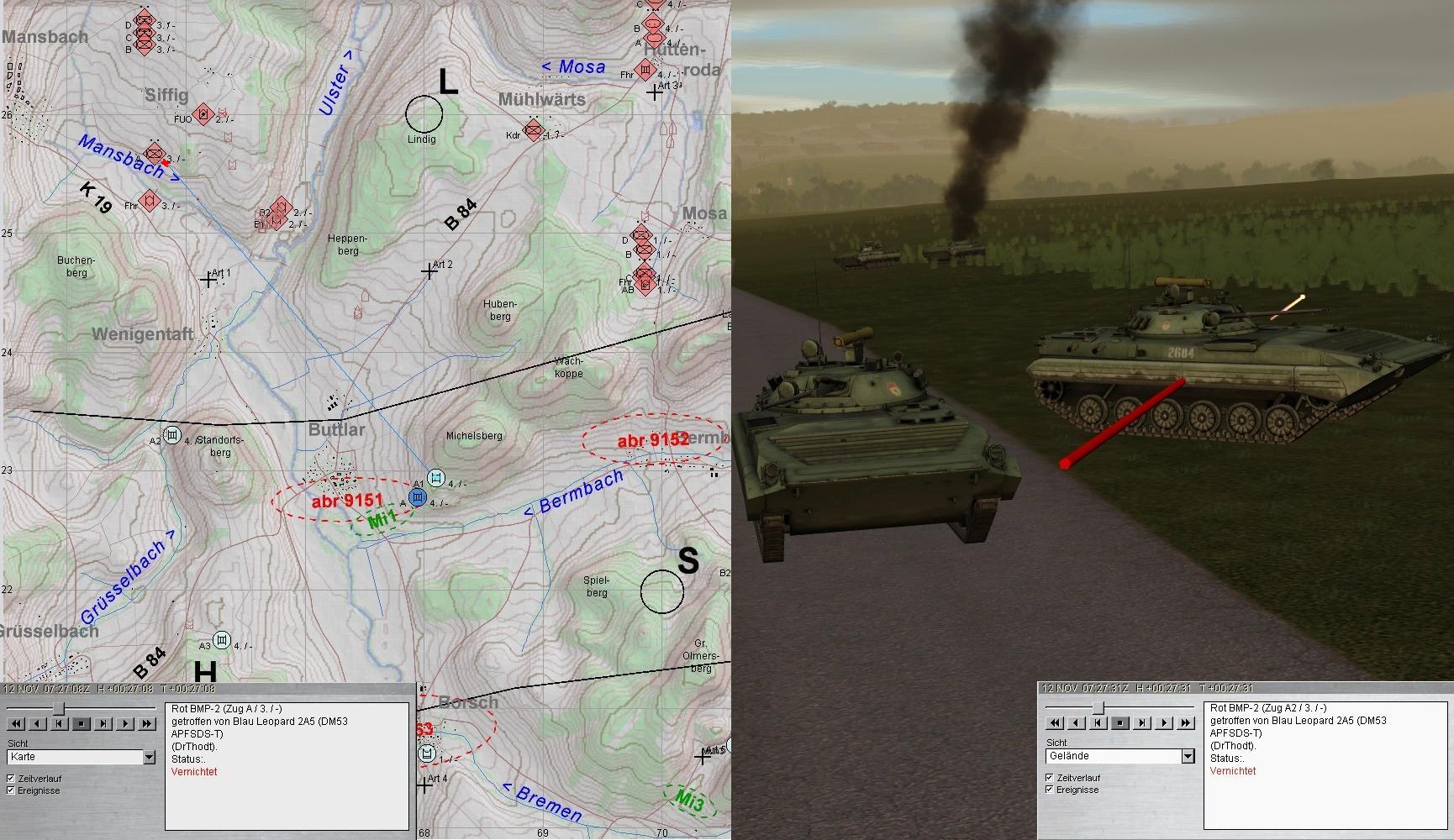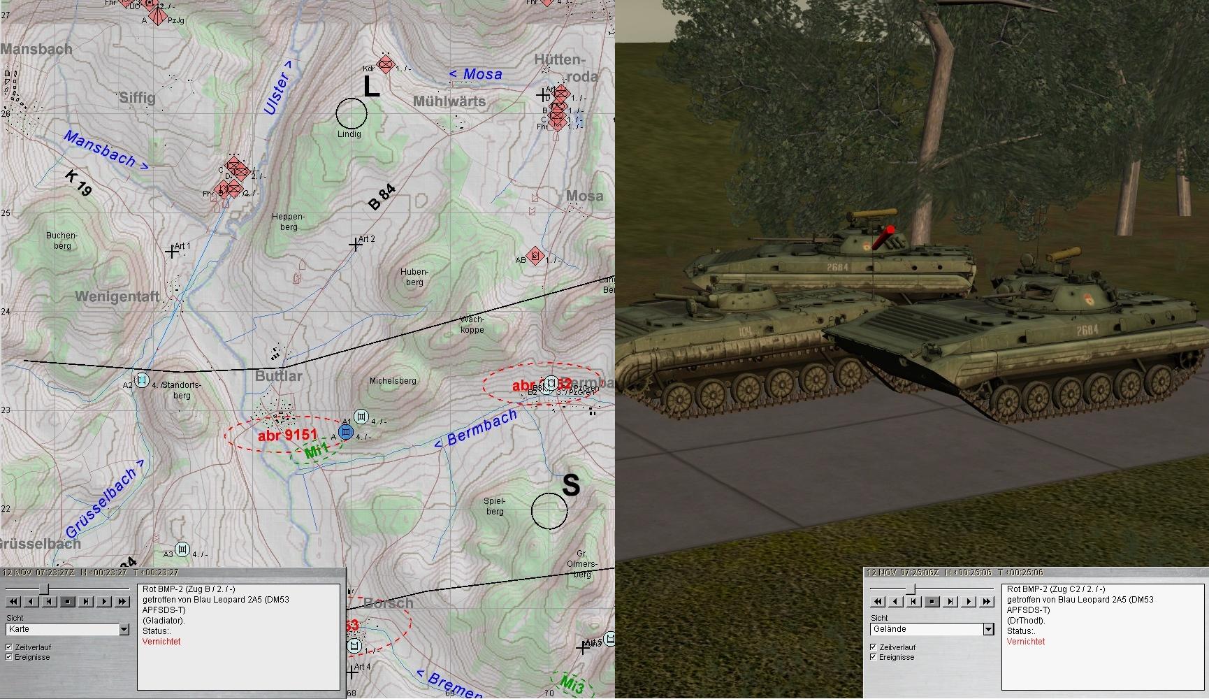 Auch diese fielen den Leos zum Opfer. Dann wurden die Spitzen zweier BMP-Kp erkannt: eine hart westl ULSTER und eine aus N Richtung HÜTTENRODA auf B2 u. 3 zu: