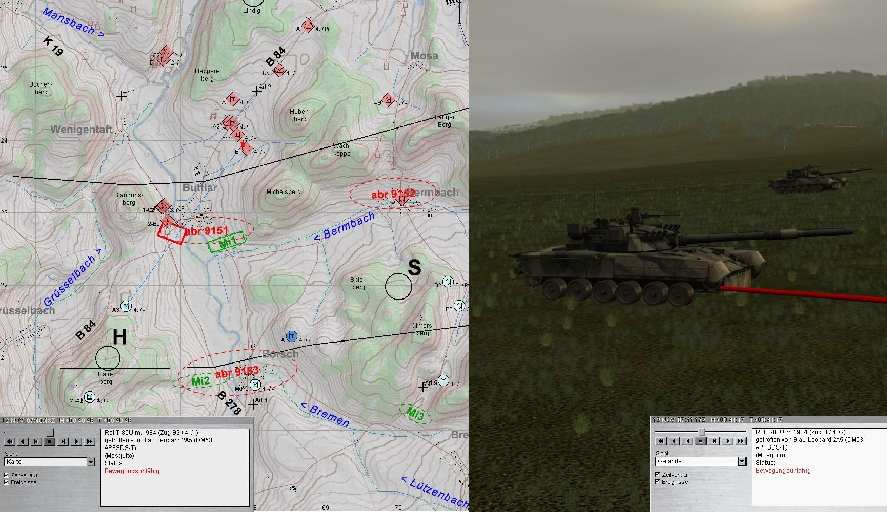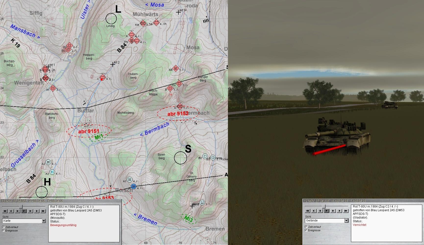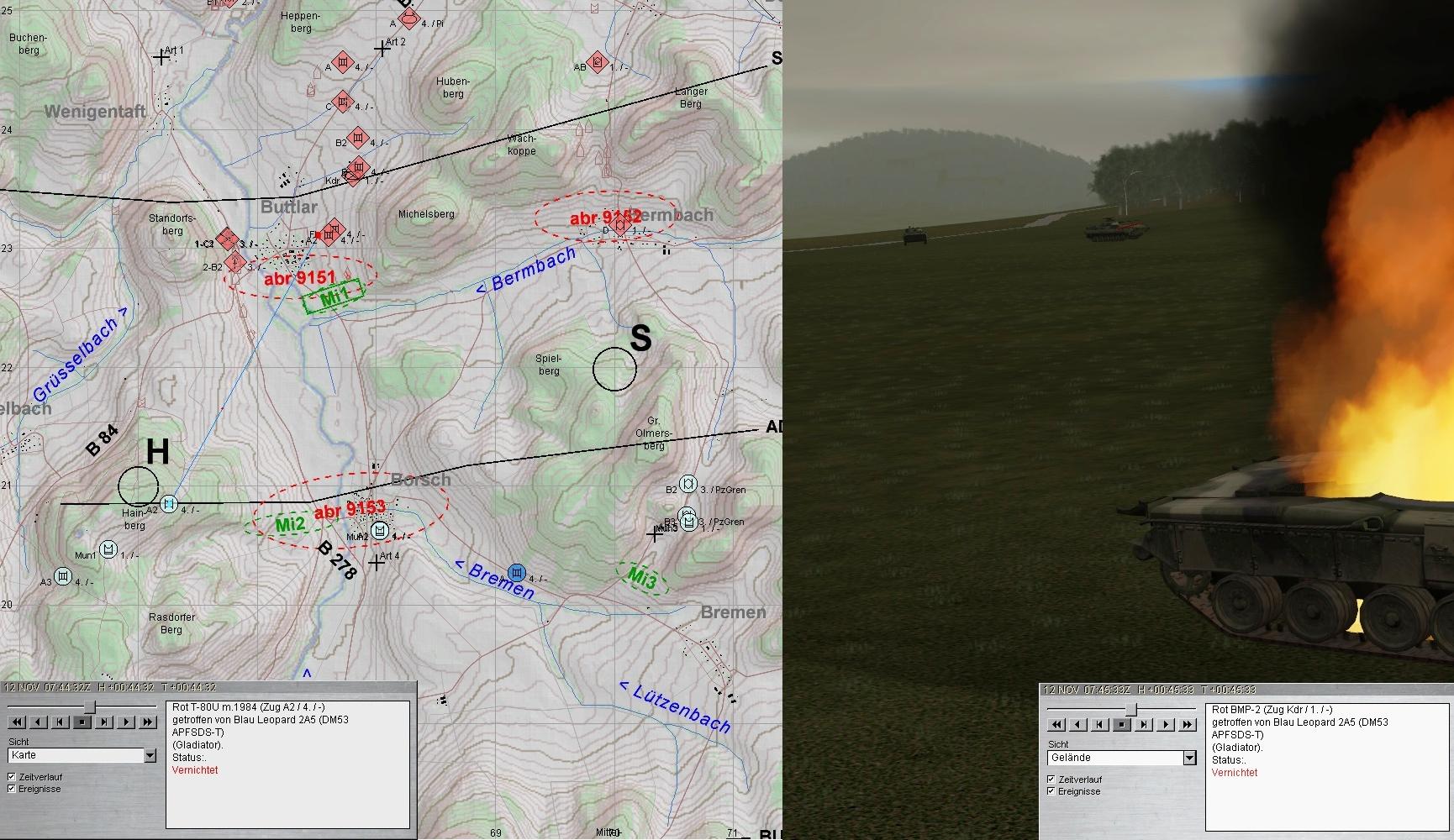 Auch diese fielen den Leos zum Opfer. Dann wurden die Spitzen zweier BMP-Kp erkannt: eine hart westl ULSTER und eine aus N Richtung HÜTTENRODA auf B2 u. 3 zu:
