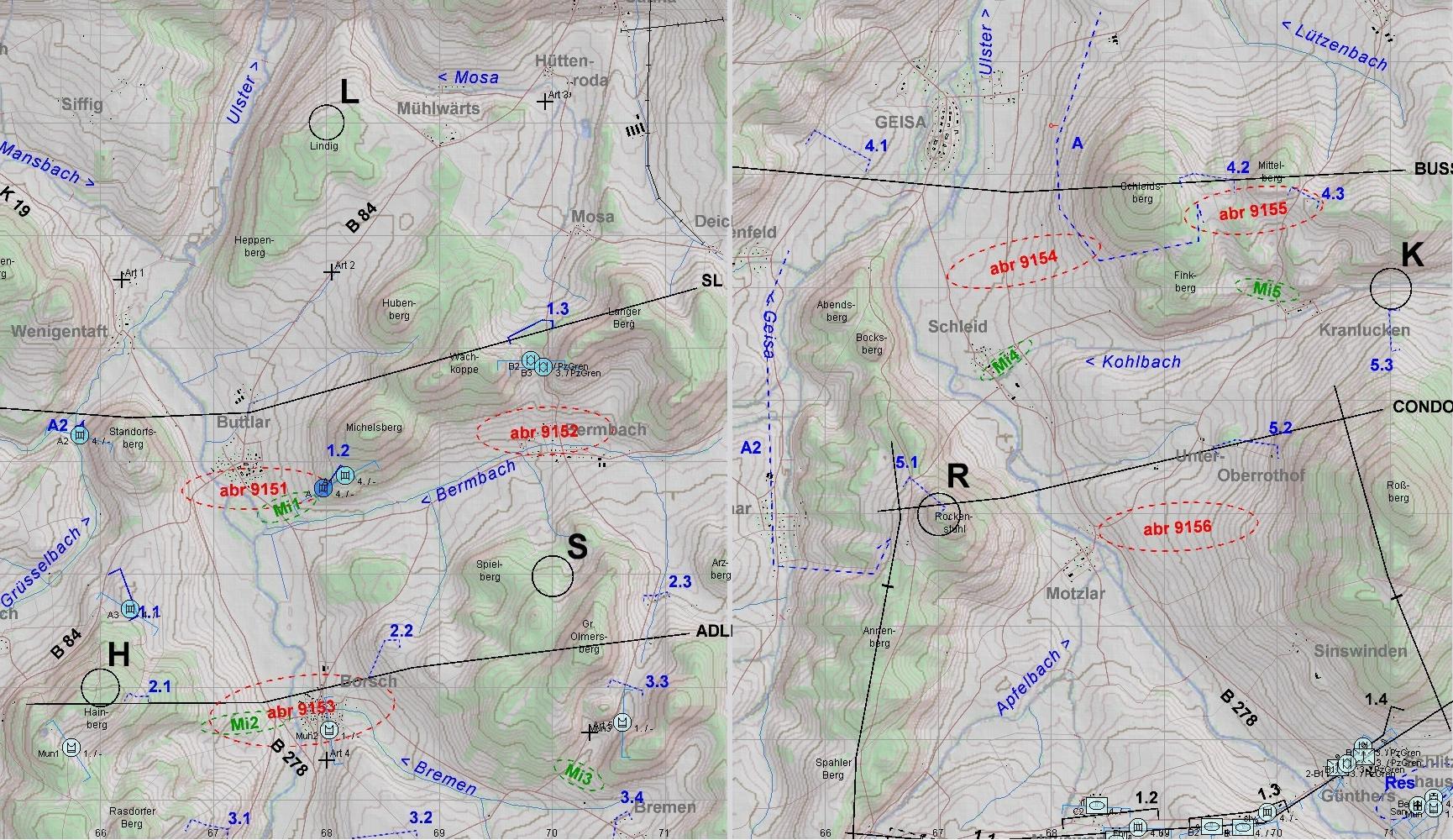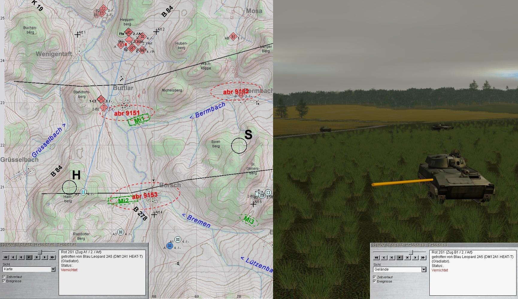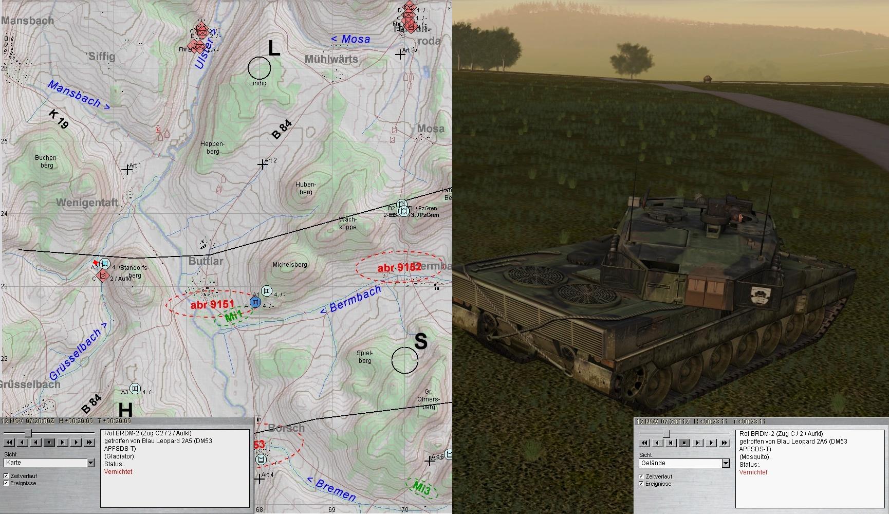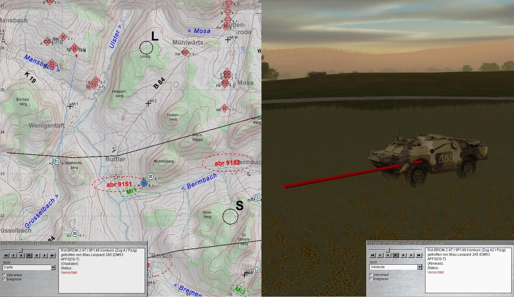 Auch diese fielen den Leos zum Opfer. Dann wurden die Spitzen zweier BMP-Kp erkannt: eine hart westl ULSTER und eine aus N Richtung HÜTTENRODA auf B2 u. 3 zu: