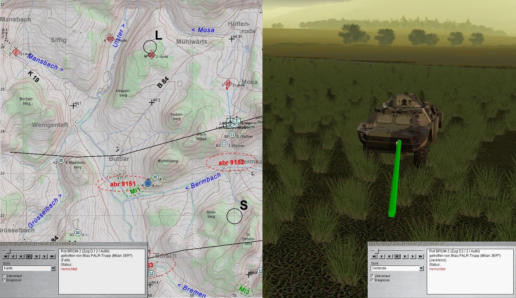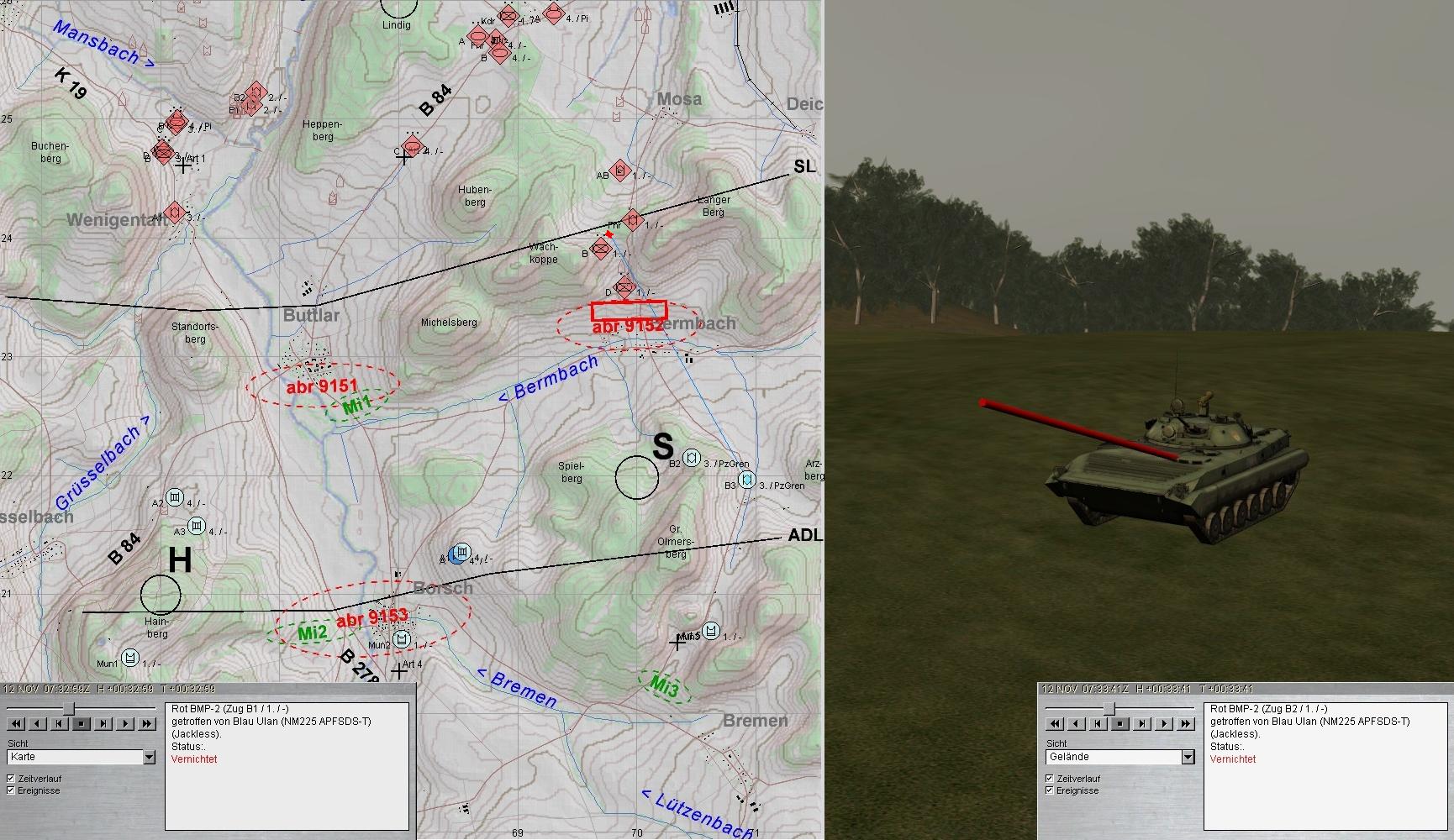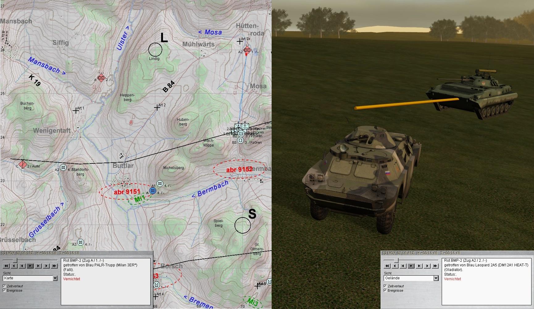 Währenddessen wurde die 2 Staffel des vstk BMP-Btl unter Feuer genommen: 1 BMP-Kp bei BUTTLAR westl der ULSTER und eine T-80-Kp ostwärts: