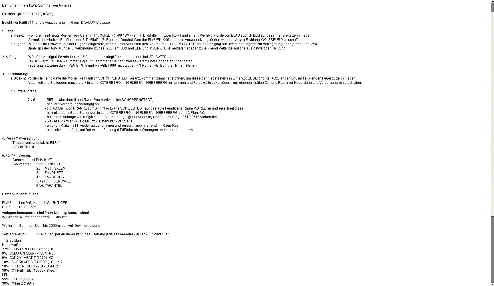 Das verstärkte PzBtl 911 konnte unter Verlusten den Angriff der 1. DivStaffel (BMP- und PzRgt) abwehren. 911 muss noch mindestens 1 Stunde gegen die 2. DivStaffel einer GdPzDiv halten, um zu versorgen und sich neu zu ordnen.