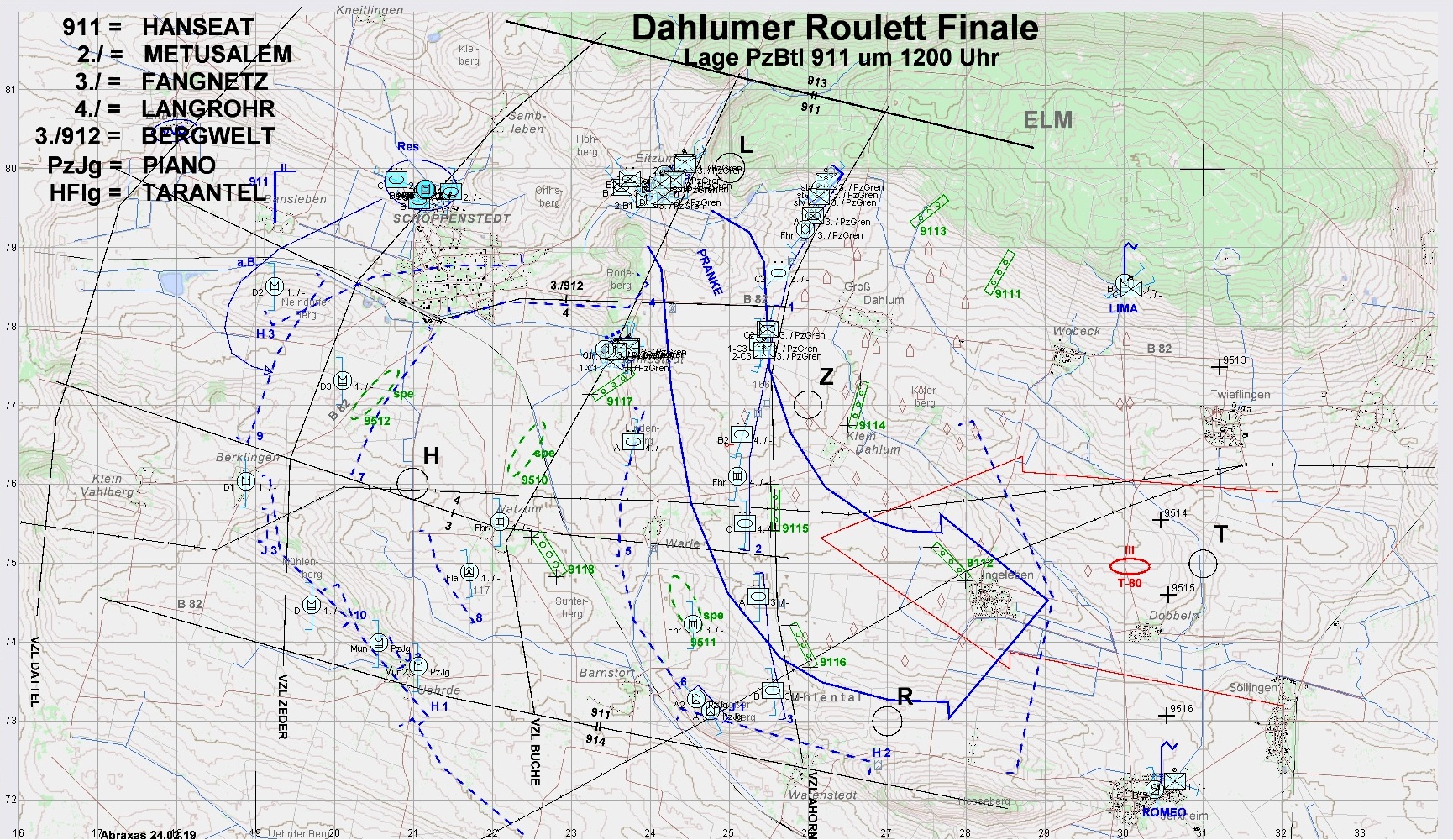 Dafür hat 911 einen Schwarm TIGER abrufbereit zugewiesen erhalten. Die BtlReserve 2./911 ist vom Gegenangriff zurück und versorgt.