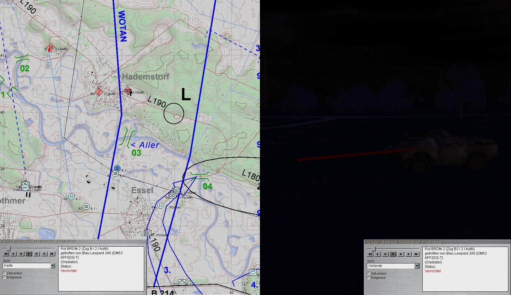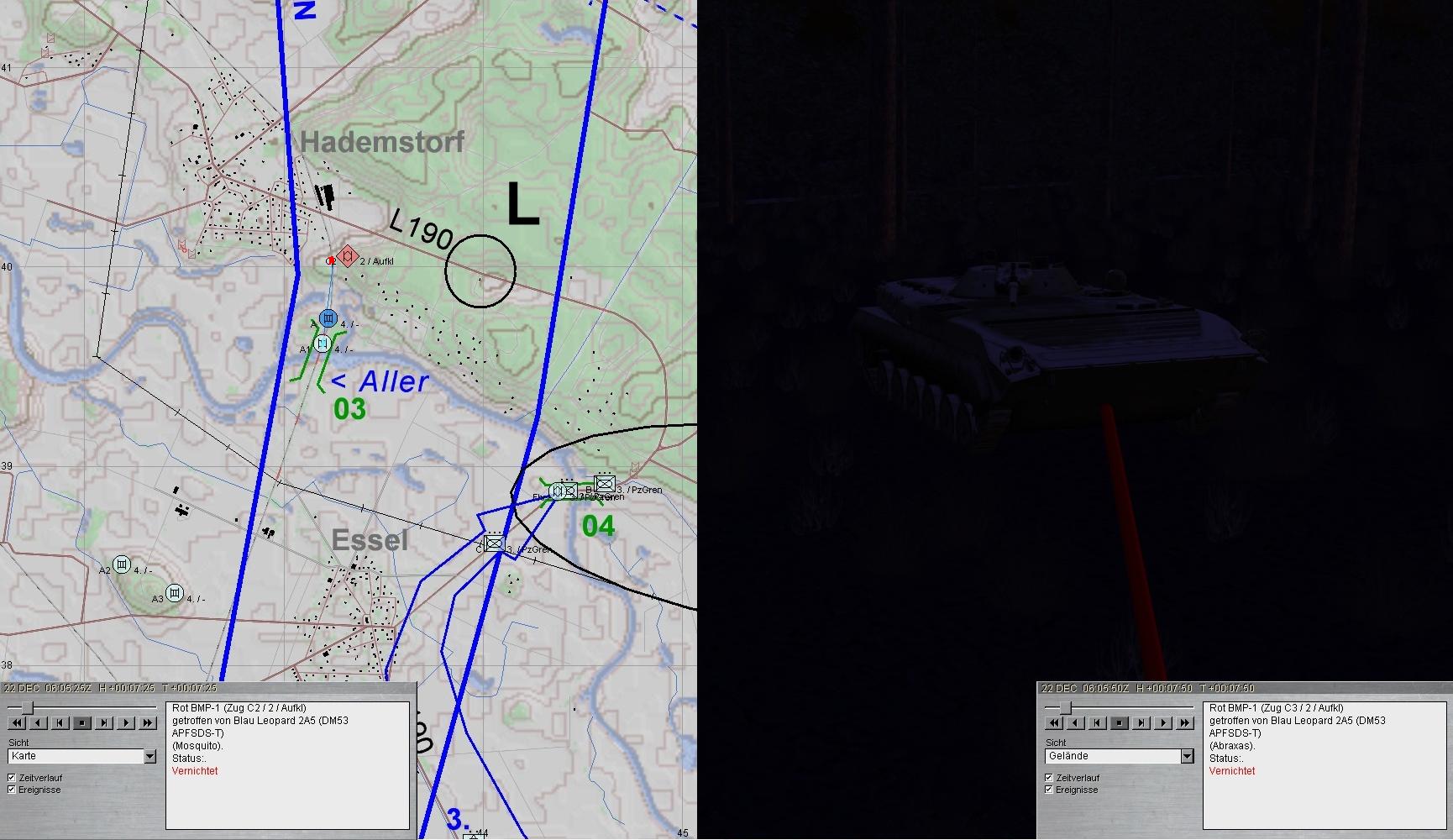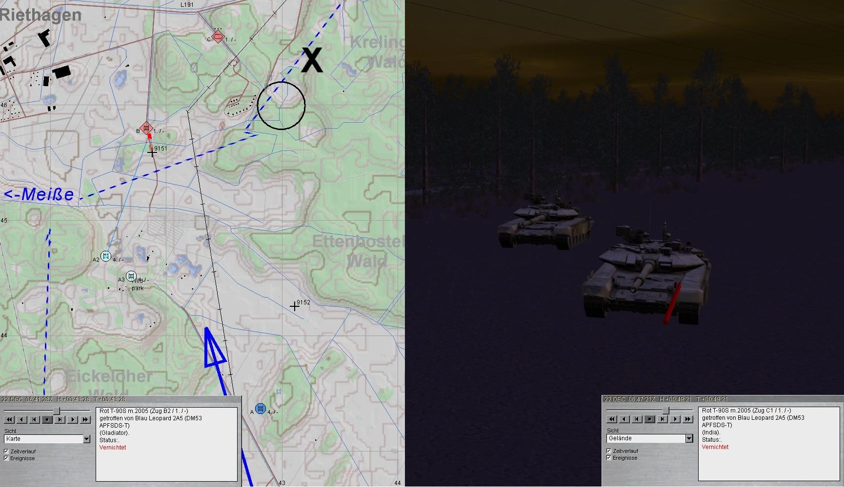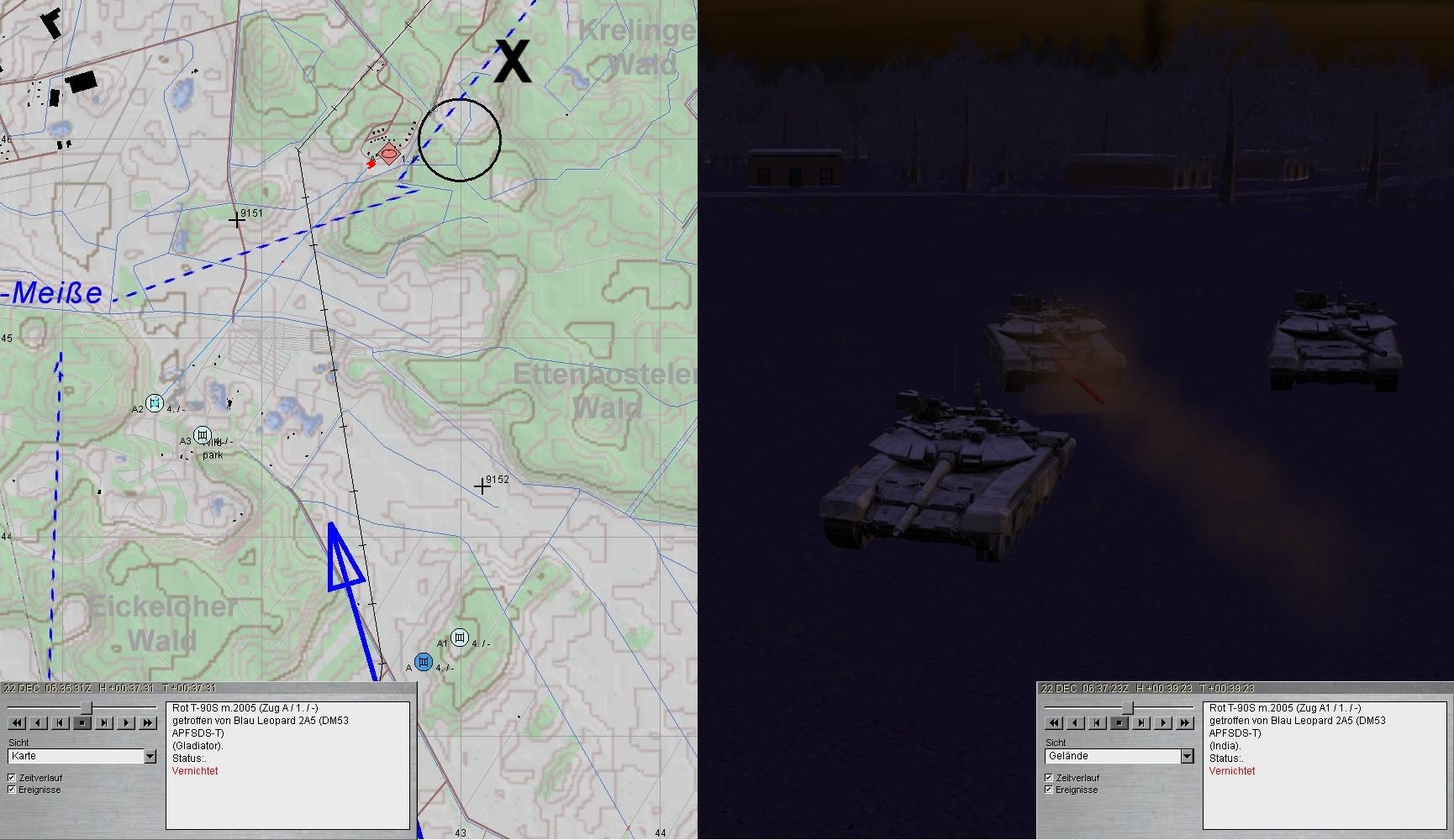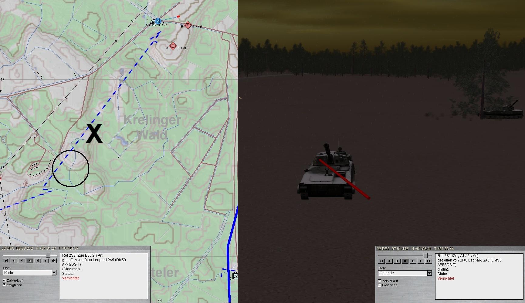 Die fdl T-90-Kp war unter Verlusten vernichtet und A (A2) erhielt den Befehl die Aufklärung von FRIDOLIN A zu übernehmen. A2 trat an und stieß auf fdl Artillerie. Nach kurzem Feuerkaft waren die 2-S-1 und 2-S-3 vernichtet!