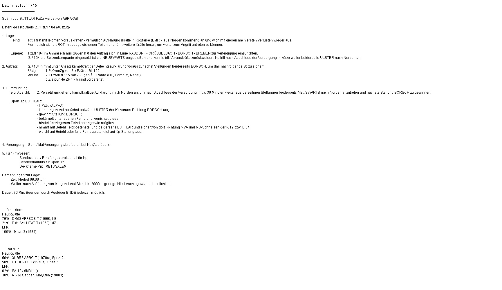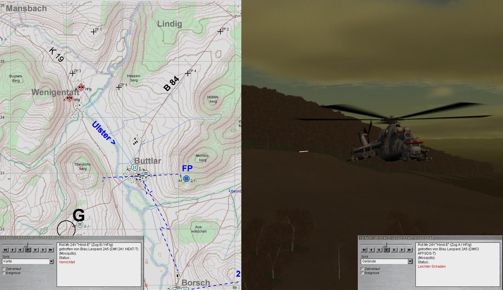 Nach kurzer Ruhephase klärte A1 Feindpanzer in Zg-Stärke aus MANSBACH kommend auf: GefAufklärung einer Kp? Das Feuer wurde auf 3000 eröffnet:
