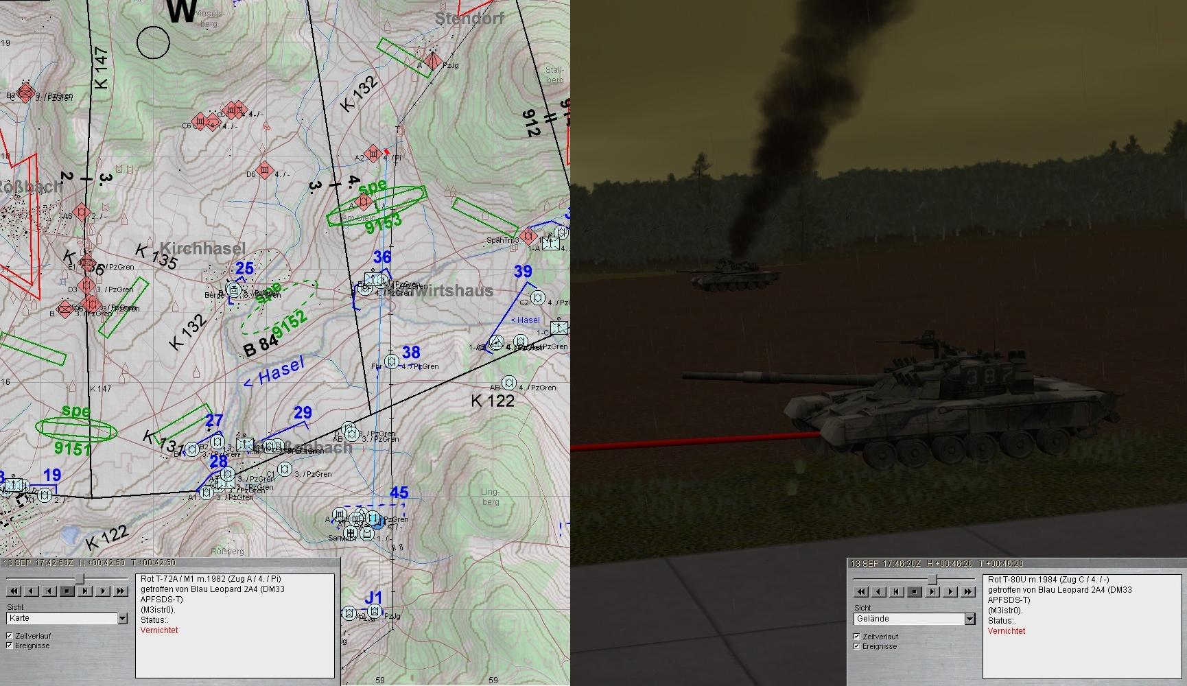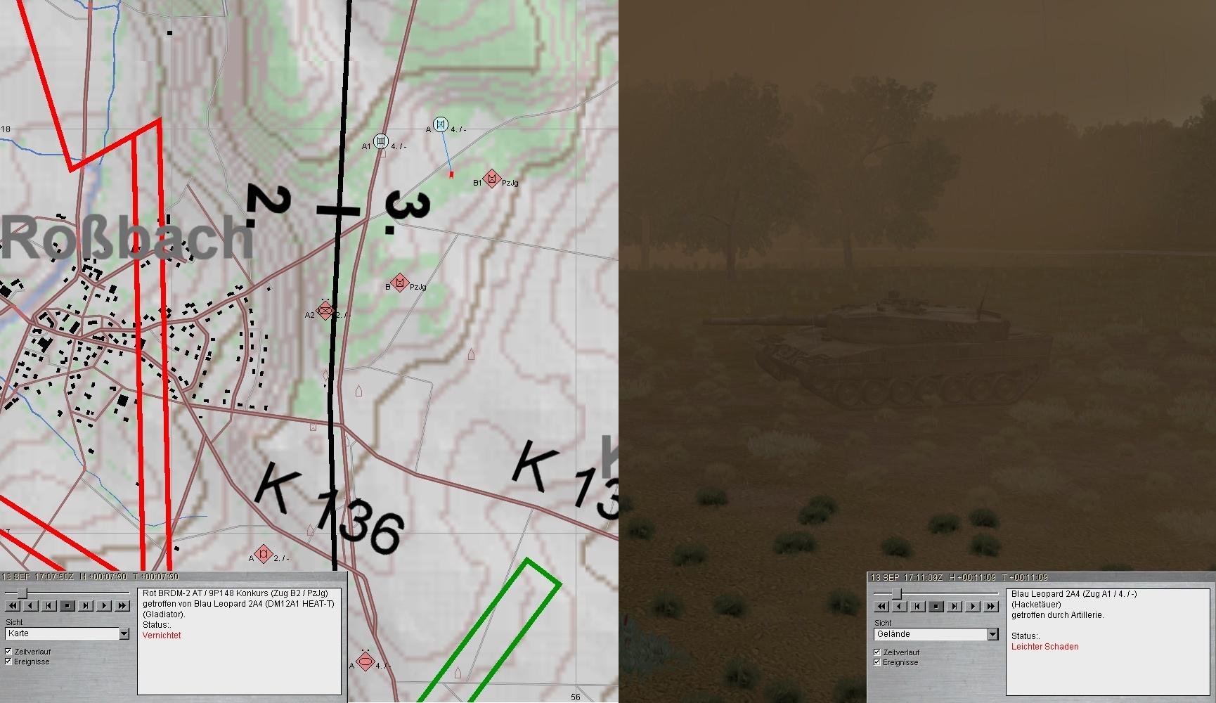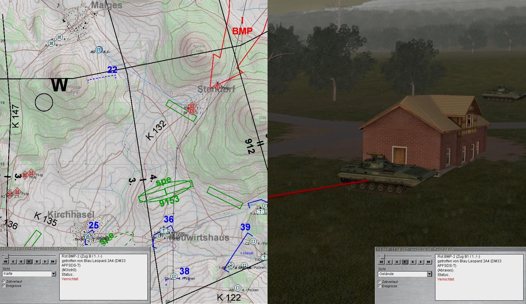 A-Zug wich nach Beheben der Schäden gruppenweise aus. Während 2. Grp die BMP in STENDORF bekämpfte, stieß 1. Grp auf einen fdl PzJgZg und eröffnete das Feuer. Beim weiteren Antreten geriet 1. Grp in eigenes, geskriptes ArtFeuer: A1 Ausfall EMES!