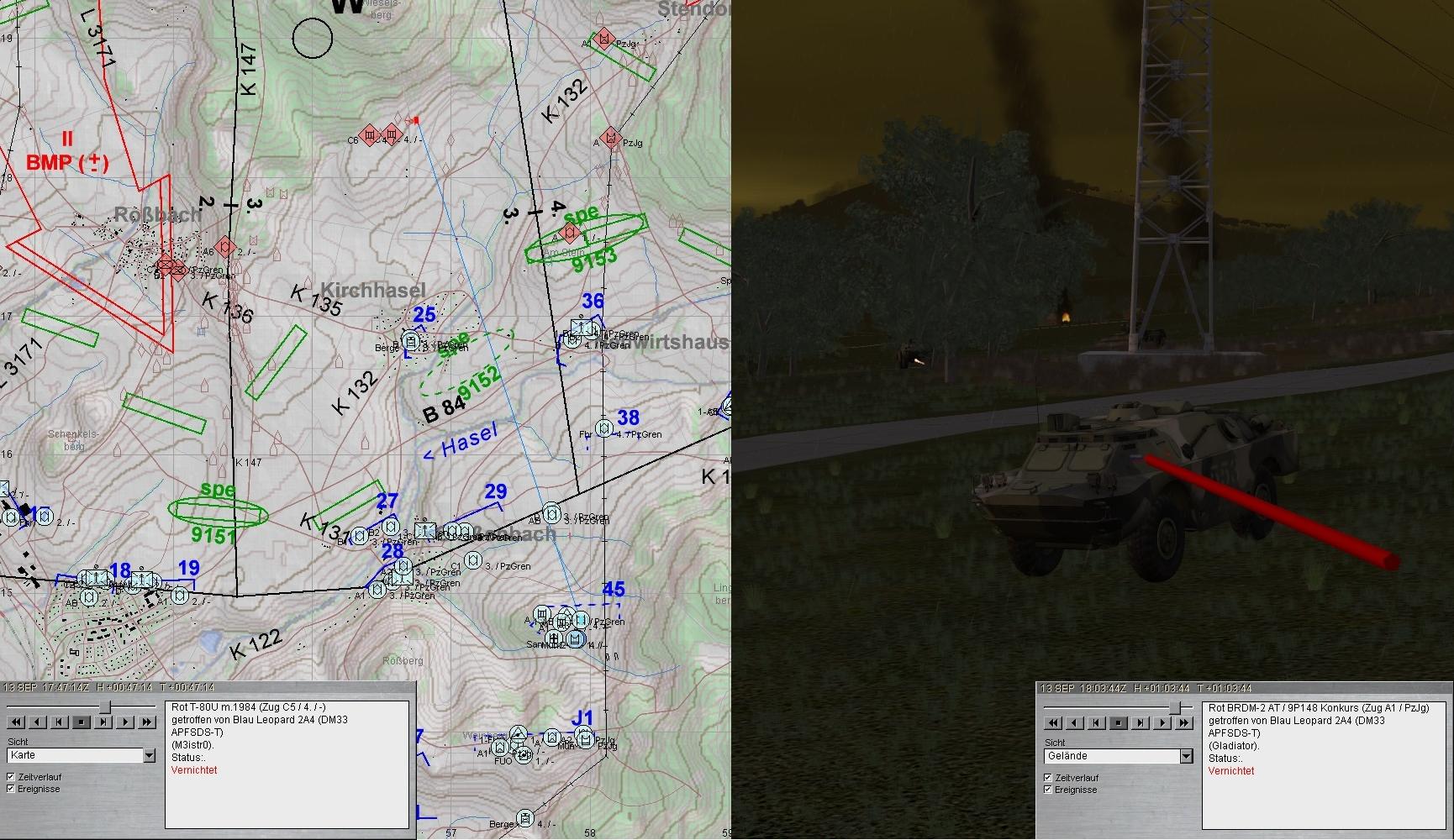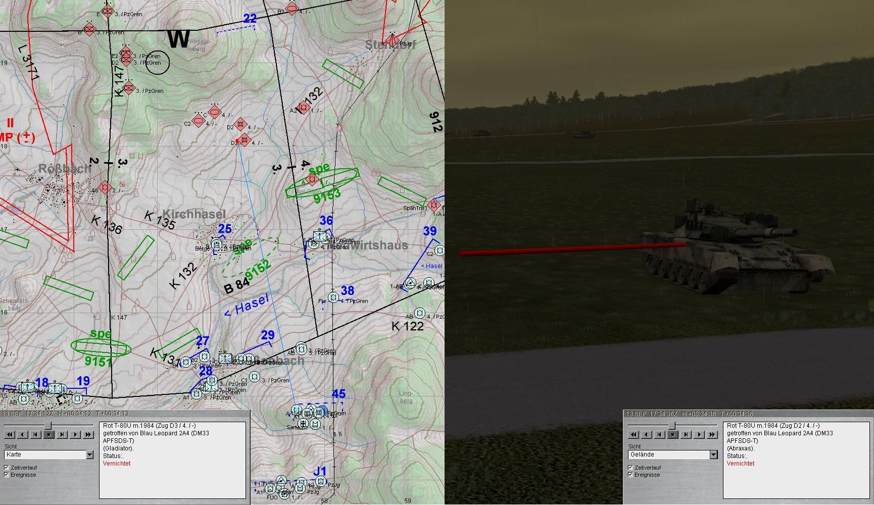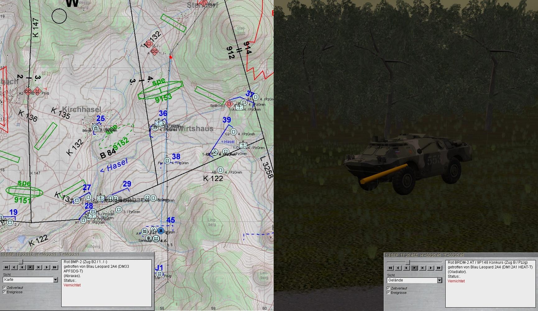 A-Zug wich nach Beheben der Schäden gruppenweise aus. Während 2. Grp die BMP in STENDORF bekämpfte, stieß 1. Grp auf einen fdl PzJgZg und eröffnete das Feuer. Beim weiteren Antreten geriet 1. Grp in eigenes, geskriptes ArtFeuer: A1 Ausfall EMES!