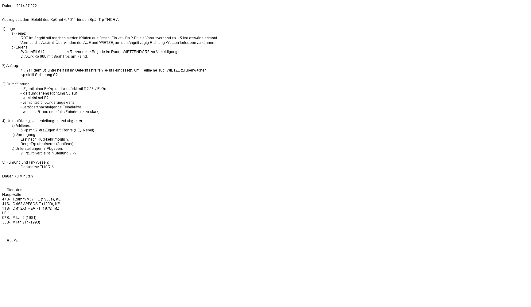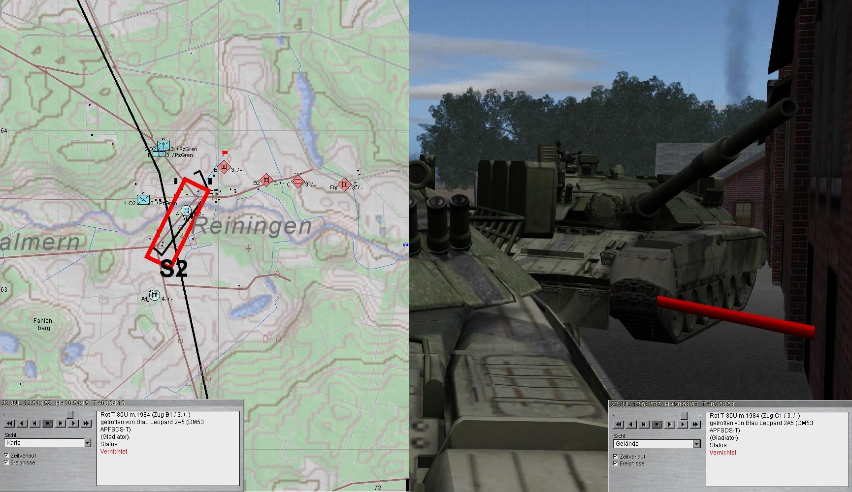 Nach kurzer Pause erkannte D2 einen T-80-Zg, der sich aus O näherte. D2 meldete dies umgehend, schoß die T-80 auf ca. 1200 kurz an und wich unter Nebel in den Wald aus.