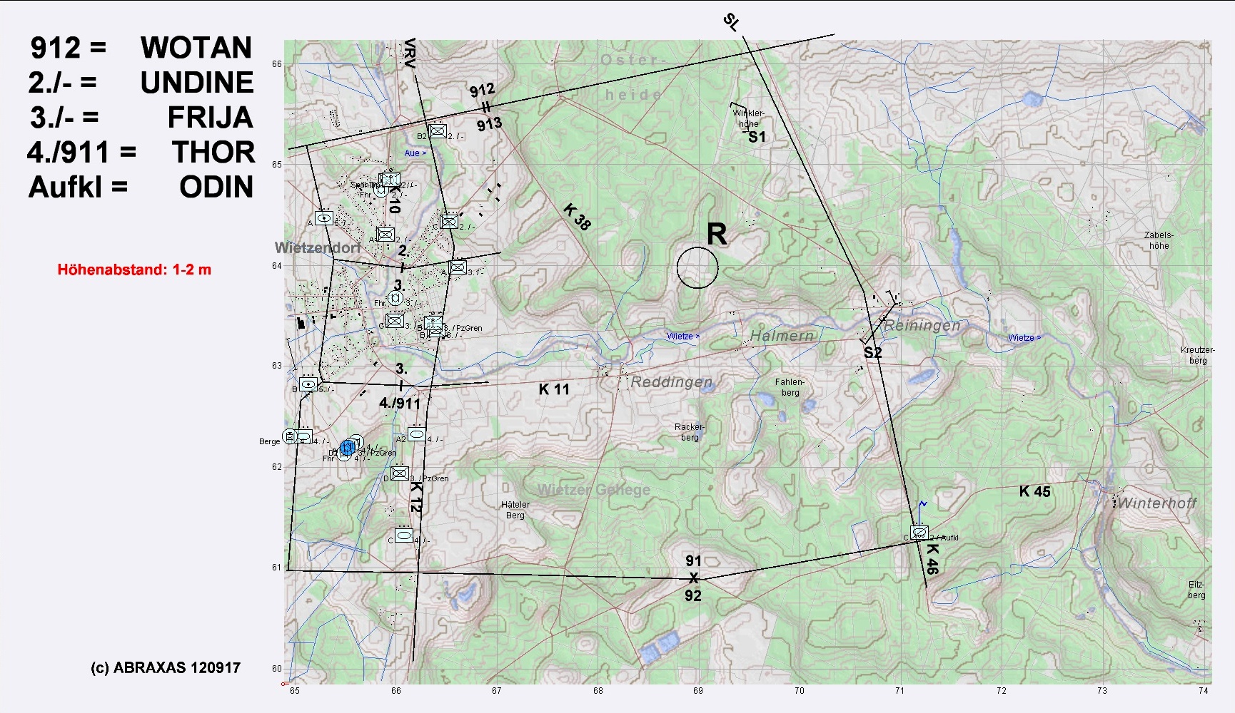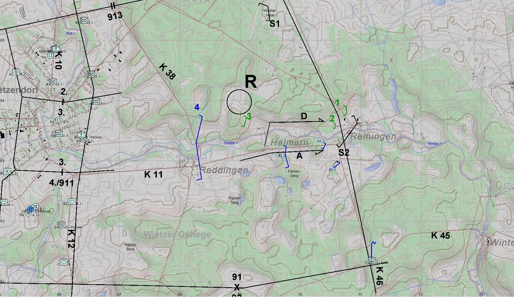 A trat mit D2 voraus sofort an und gewann schnell die geplanten Stellungen. D2 ließ absitzen und traf in REININGEN auf fdl Aufklärung, die nach kurzem Feuerkampf vernichtet werden konnte.