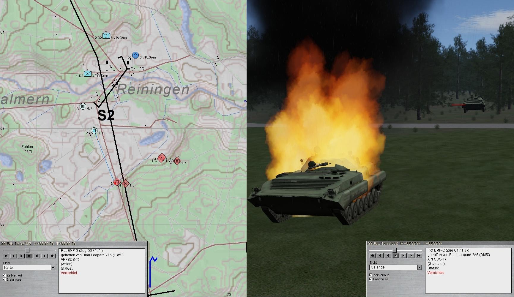 Es folgte die dazugehörige BMP-Kp aus SO. Trotz einiger wirkungsloser Treffer durch die BMP, konnte die BMP-Kp durch die PzGrp vernichtet werden: