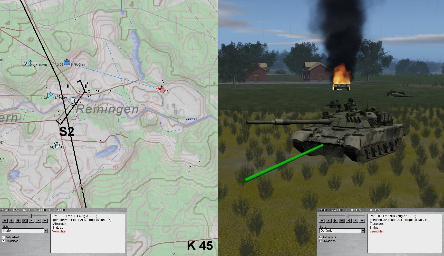 A-Fhr rief Mrs-Feuer ostwärts REININGEN ab, das A Gelegenheit verschaffte seine Stellung zu verlegen, um auf die T-80 flankierend wirken zu können. Doch der MILAN-Trp konnte das "Problem" restlos lösen.