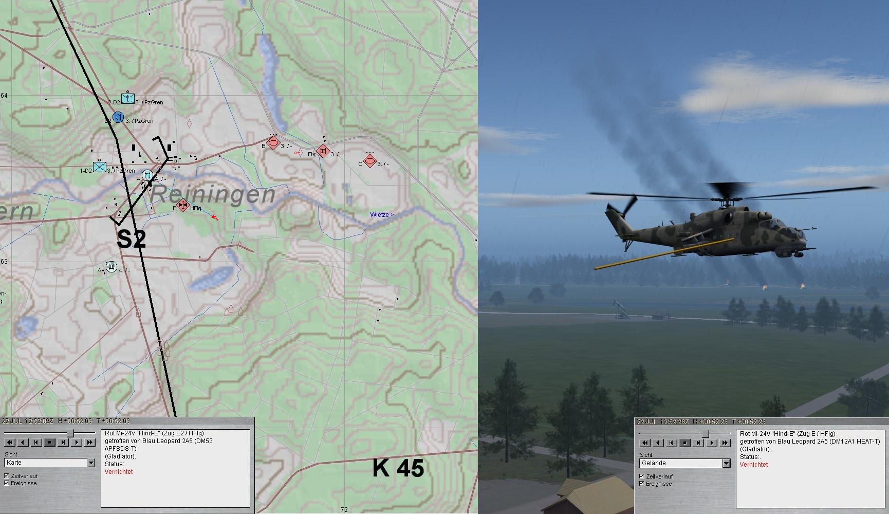 Eine Rotte HIND flog an und wurde von A und D2 erfolgreich unter Feuer genommen.
