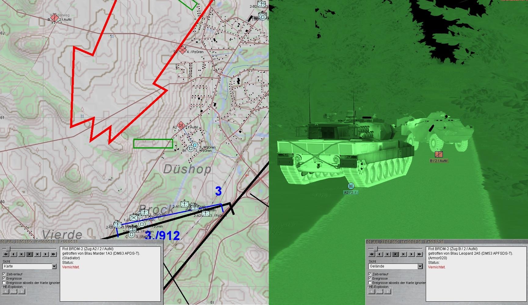 SpähTrp LUCHS 2 meldete Pazergeräusche aus Norden in Fahrt von O nach W. B-SPz setzte sich Richtung LUCHS 1 in Bewegung. ROT griff mit HIND-Rotte an: