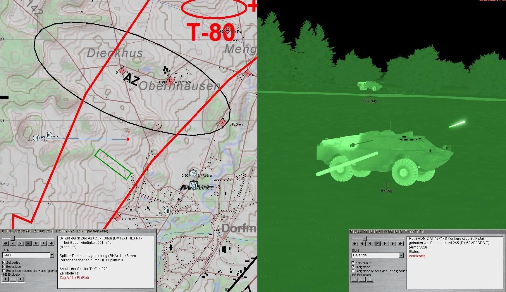 Kaum waren die HINDs vernichtet, traf B-SPz auf nächster Entfernung auf T-80-Zg, nebelte und wich unter BMK-Feuer aus. Ein Treffer des Marderturmes unterband weiteren Feuerkampf und so musste B-SPz sich Rihtung A-Zg durchpieseln!