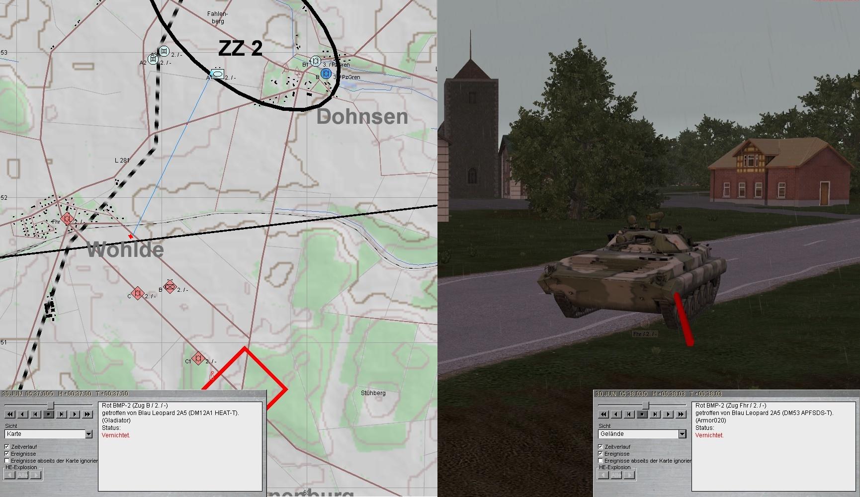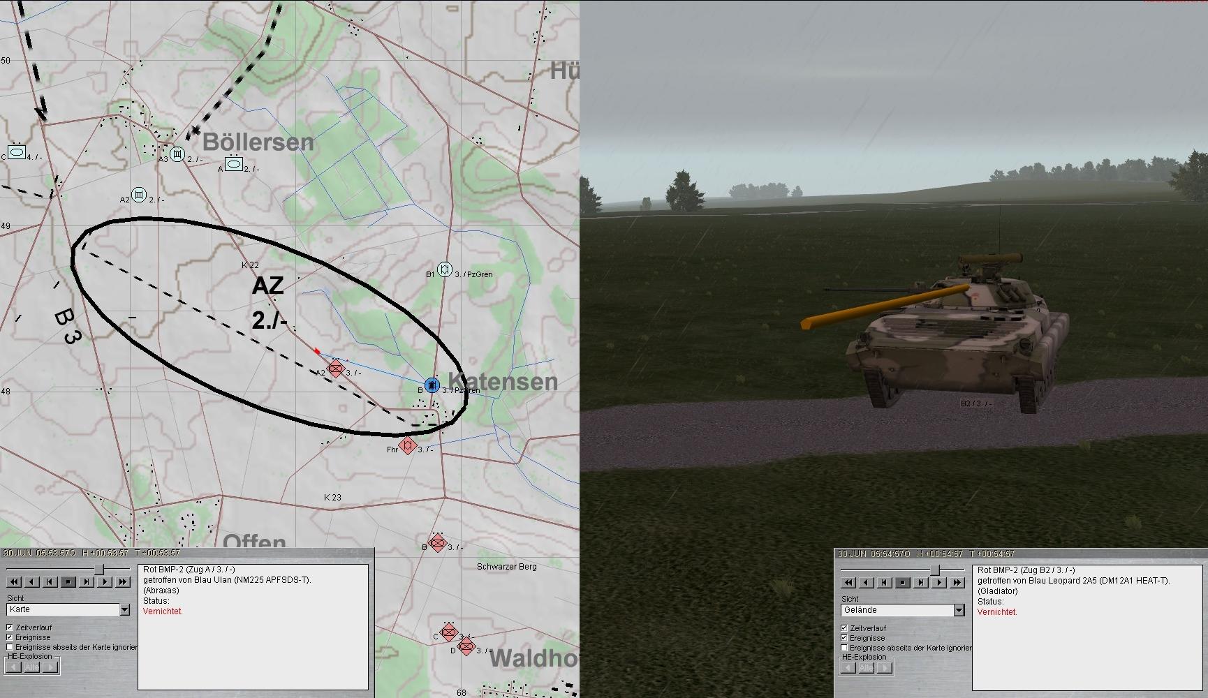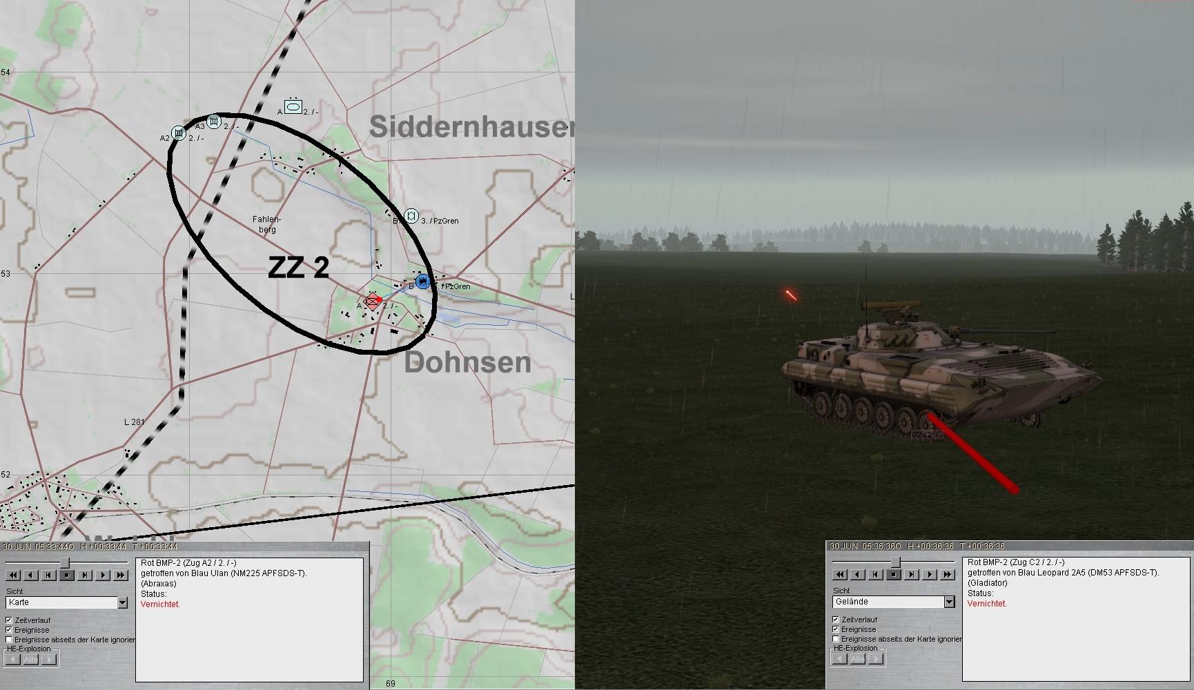 Im Antreten auf das ZZ1 wurden abgesessene Schützen im ZZ1 von A2 vernichtet. B erkannte fdl Aufklärung in der Flanke von 2. PzGrp, warnte und eröffnete das Feuer: