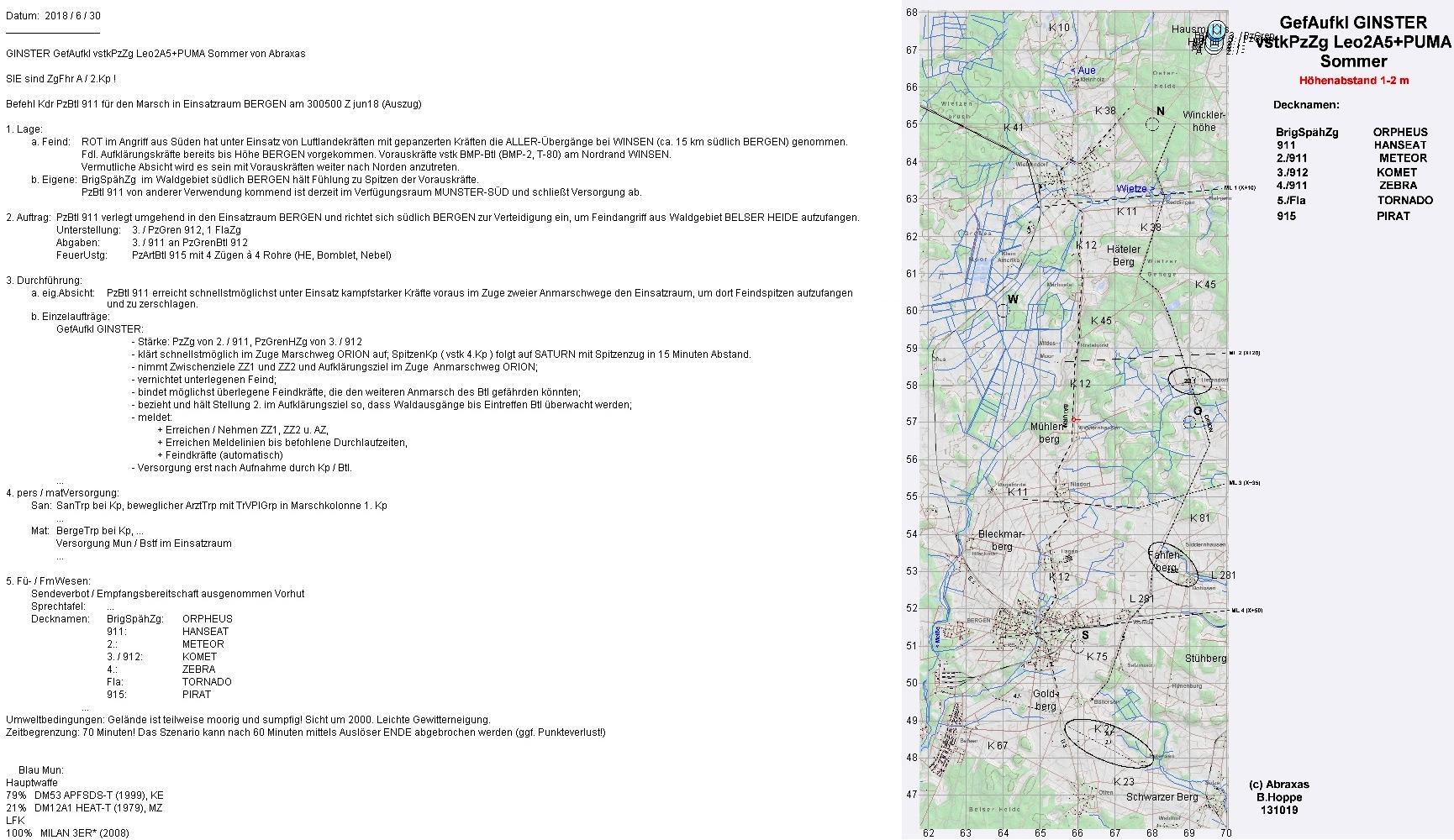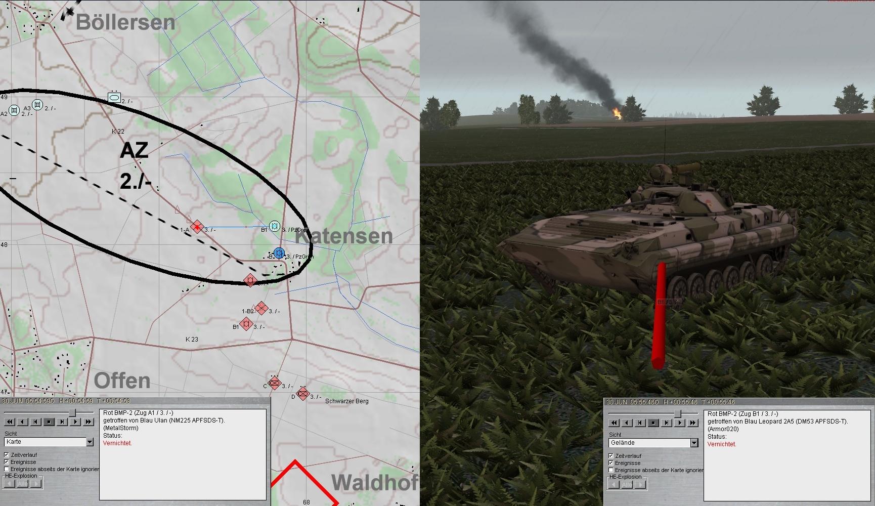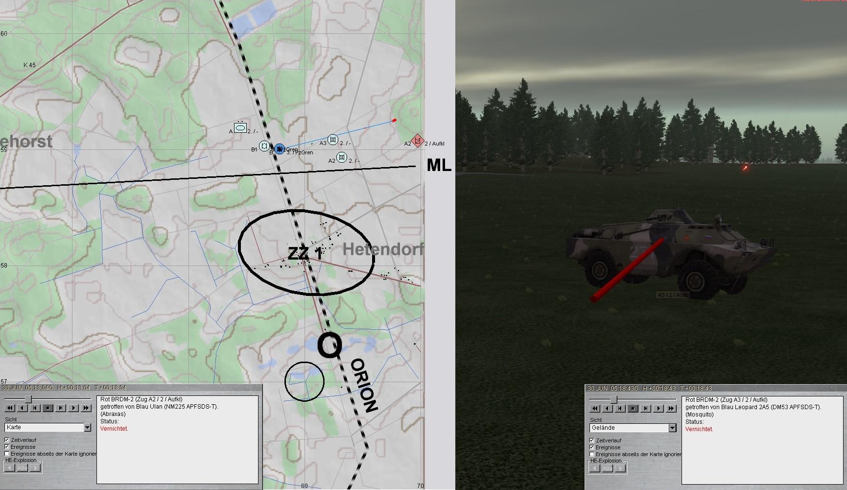 Im Antreten auf das ZZ1 wurden abgesessene Schützen im ZZ1 von A2 vernichtet. B erkannte fdl Aufklärung in der Flanke von 2. PzGrp, warnte und eröffnete das Feuer: