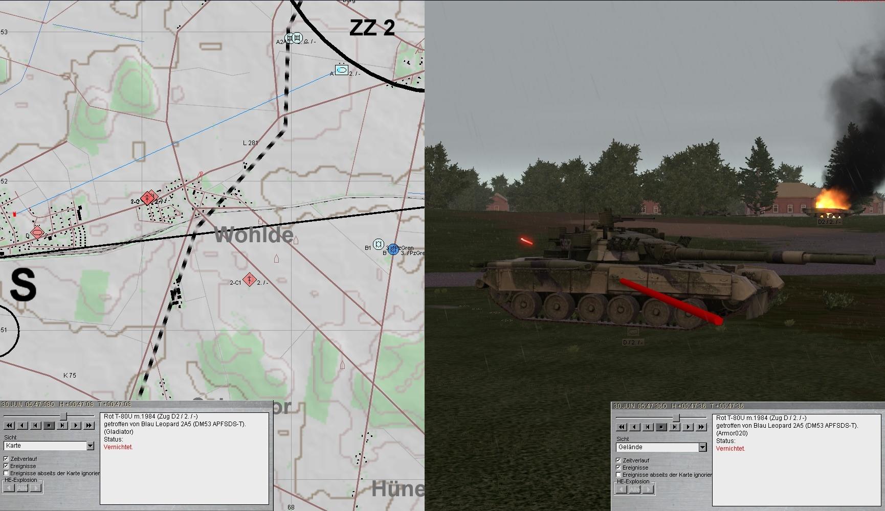 Als das ZZ2 letztlich genommen war und weiter auf AZ angetreten wurde, erkannte A einen T-80-Zug in rechter Flanke. Das Feuer wurde sofort eröffnet und die T-80 blieben auf der Strecke: