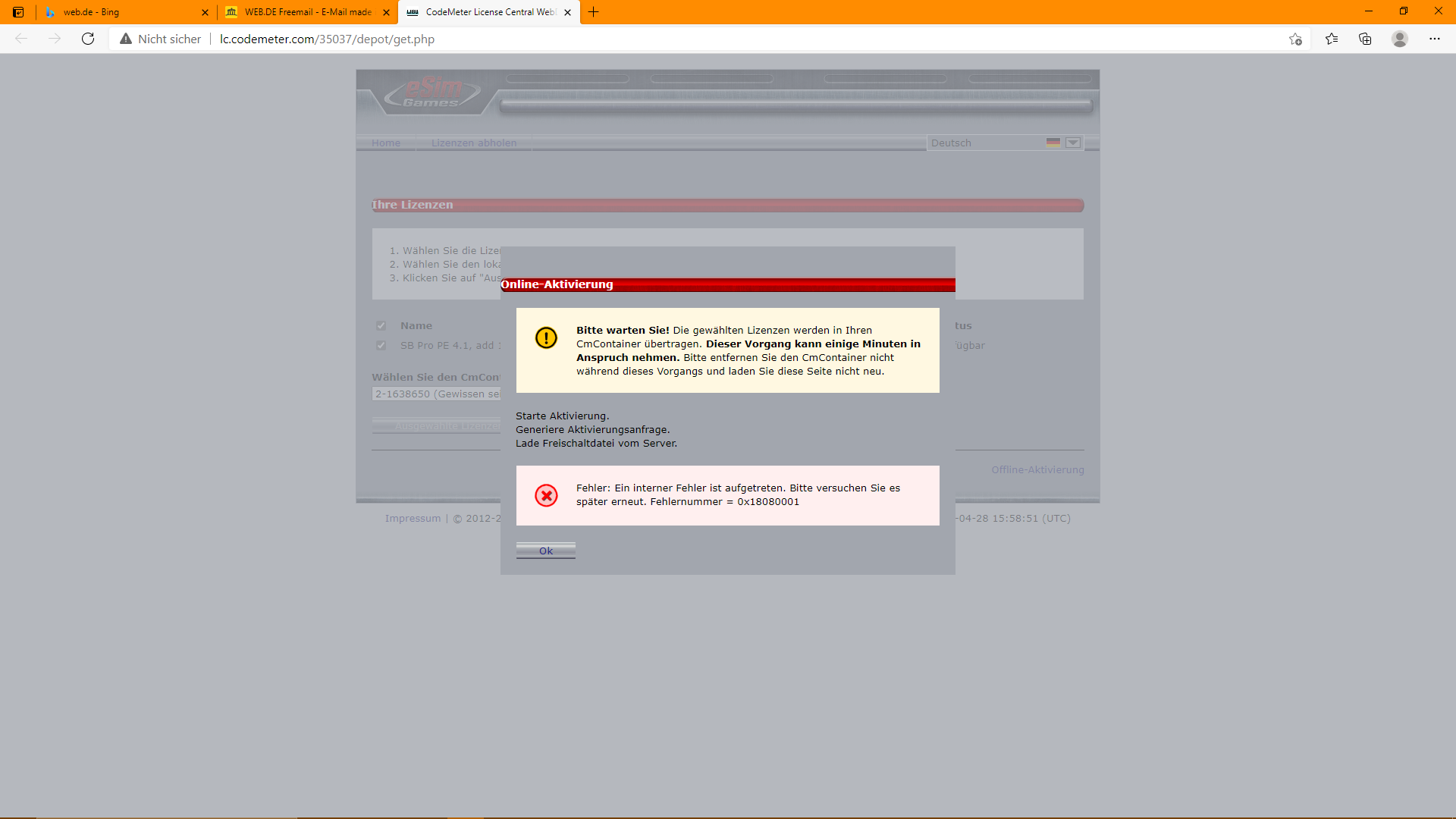 ich heiße Jan Peter und ich bin neu hier im Forum. Das aktuelle Version von Steel Beasts habe ich runtergeladen und wollte diese für einen Monat testen. Daher habe ich erstmal eine Monatslizenz erworben. Der Link wurde mir geschickt und CodeMeter ist installiert. Doch leider lässt sich die Monatslizenz nicht aktivieren, bzw. erhalte ich die folgende Fehlermeldung, siehe Screenshot.