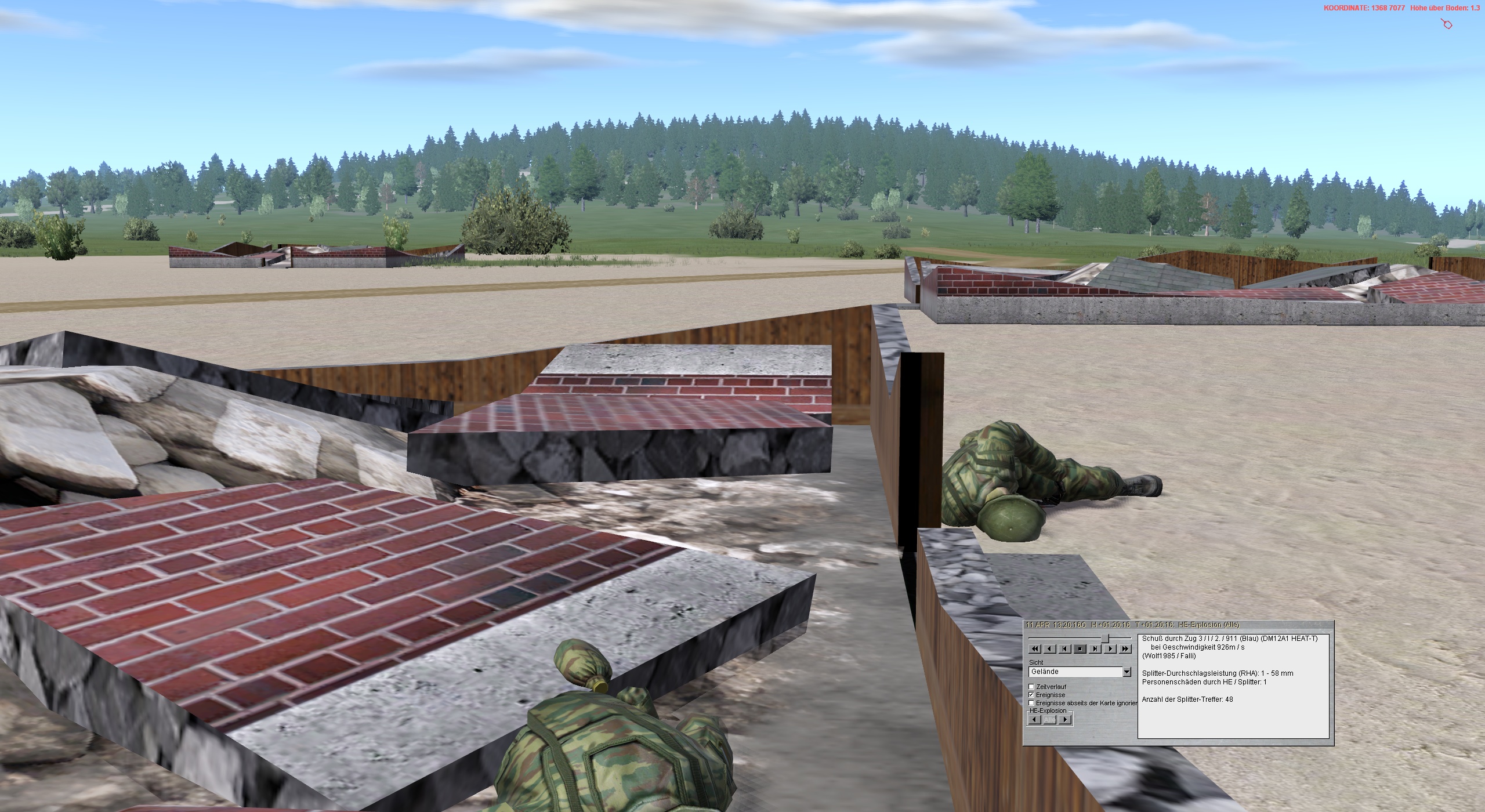 Das weitere Antreten auf OBJ geschieht langsam und umsichtig. Leider wird zu Spät erkannt, dass die Häusergruppe bei Objekt feindbesetzt ist. ALFA 3 erhält einen PA Treffer aus einem der Häuser.