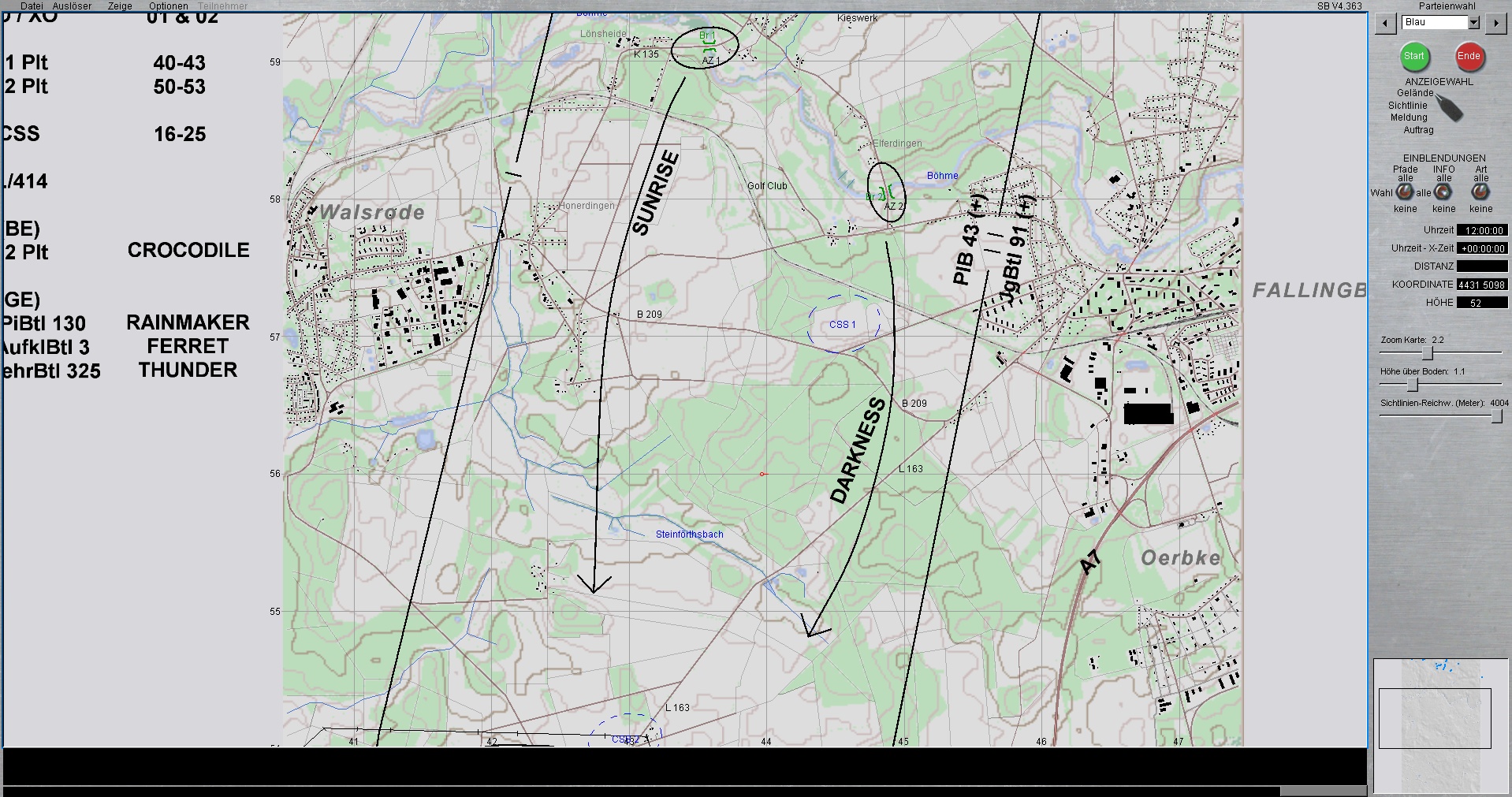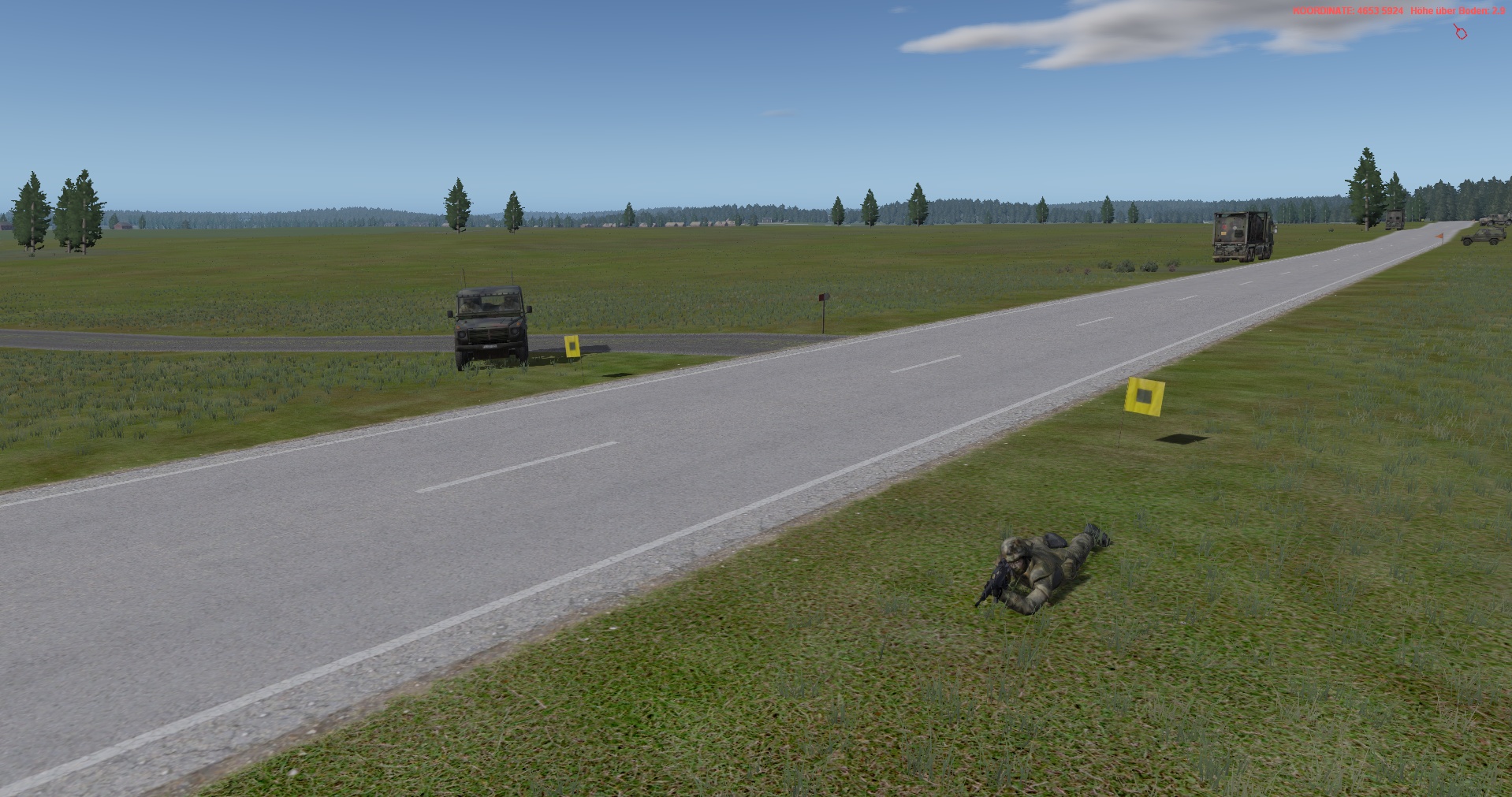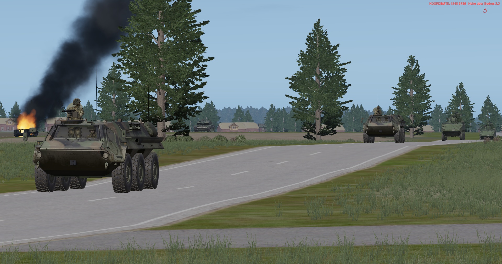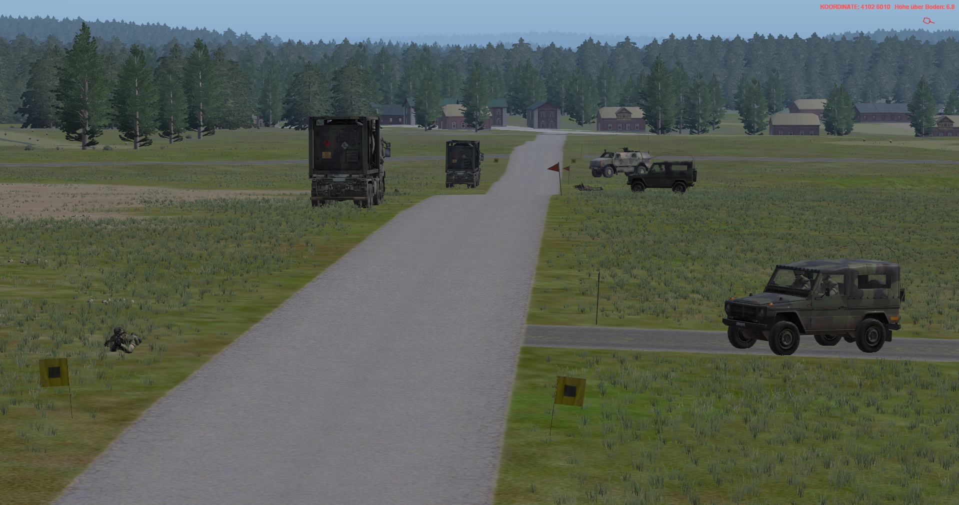 Der Panzerzug, vstk durch einen PzGrenHalbzug + den stv KpChef (02), werden der Kompanie voraus antreten. Sobald die Freifläche vor dem OBJ erreicht worden ist, geht die Kompanie in Sturmausgangsstellung und bereitet sich auf den Angriff auf das OBJ vor. Die Endstellungen im OBJ, sind für die jeweiligen Züge sind bereits eingetragen.